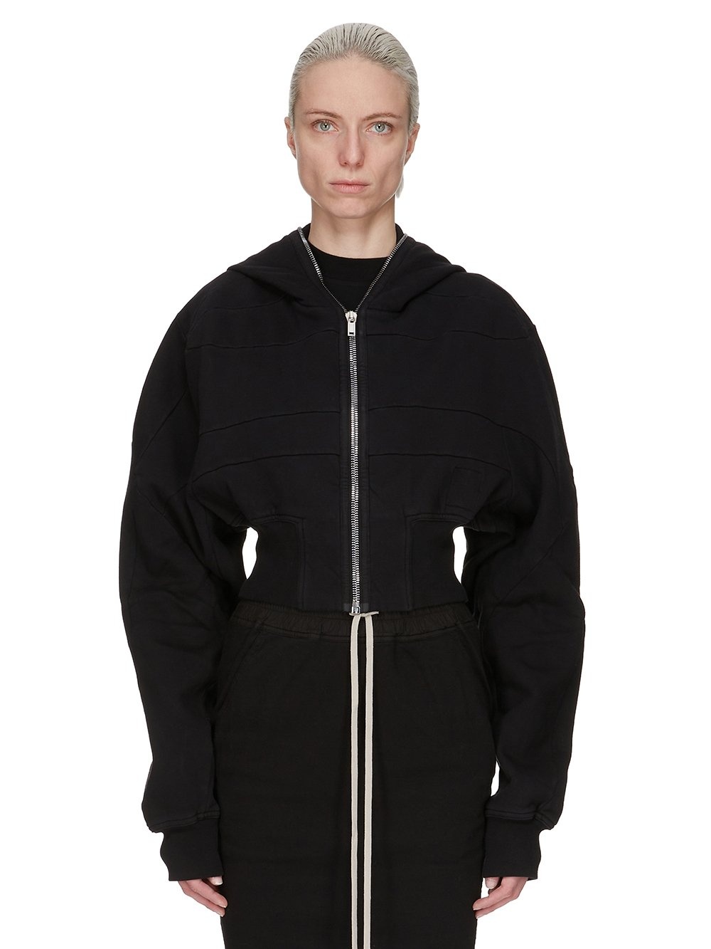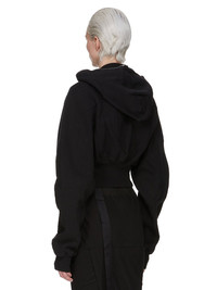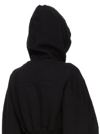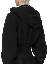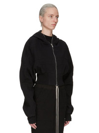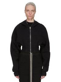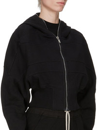 DRKSHDW SS25 HOLLYWOOD COLLAGE GIMP HOODIE IN BLACK FURKA HEAVY SWEATSHIRT THIS COLLAGE GIMP HOODIE IS CROPPED WAIST LENGTH AND HAS LONG SLEEVES. IT HAS A FRONT ZIPPER CLOSURE WITH EXPOSED ZIPPER TAPE THAT RUNS FROM THE HEM ALL THE WAY UP THROUGH THE HOOD, ALLOWING IT TO BE ZIPPERED COMPLETELY CLOSED OVER THE FACE. IT FEATURES GEOMETRIC GIRDERED SHOULDERS, AND STITCHING, A FRONT AND BACK YOKE AND HAS RIBBED CUFFS AND WIDE WAISTBAND THIS HEAVYWEIGHT COTTON SWEATSHIRT JERSEY HAS A SOFT AND WASHED HANDFEEL. THIS JERSEY IS GARMENT DYED THIS FABRIC IS MADE USING GOTS CERTIFIED ORGANIC COTTON WHICH MEANS THE NATURAL FIBER IS GROWN WITHOUT HARMFUL CHEMICALS, LEAVING OUR SOIL, AIR AND WATER CLEANER FROM CONTAMINATES COLOR: BLACK MATERIAL: 100% COTTON MODEL IS 181CM TALL MODEL WEARS SIZE S