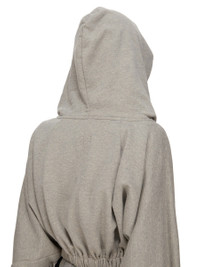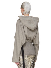 DRKSHDW FW25 CONCORDIANS CROPPED HOODED TUNIC IN MELANGE GREY FELPA JERSEY THIS CROPPED HOODED TUNIC IS WAIST LENGTH WITH LONG SLEEVES. IT HAS A LARGE HOOD AND HIGH NECK. IT FEATURES WIDE, SUPPLE, SLEEVES AND A BODY THAT GATHERS AT THE RIBBED WAISTBAND, CREATING ELEGANT DRAPING. IT HAS A LINE RUNNING DOWN THE CENTRE BACK SPINE AND A CENTRE FRONT SEAM. THIS HEAVYWEIGHT COTTON AND POLYESTER BLEND MELANGE JERSEY HAS A SOFT HANDFEEL. THIS FABRIC IS MADE USING GOTS CERTIFIED ORGANIC COTTON WHICH MEANS THE NATURAL FIBER IS GROWN WITHOUT HARMFUL CHEMICALS, LEAVING OUR SOIL, AIR AND WATER CLEANER FROM CONTAMINATES. COLOR: MELANGE GREY MATERIAL: 84% COTTON 16% POLYESTER MODEL IS 181CM TALL ITEM IS AVAILABLE IN ONE SIZE
