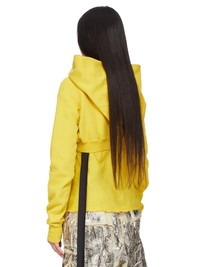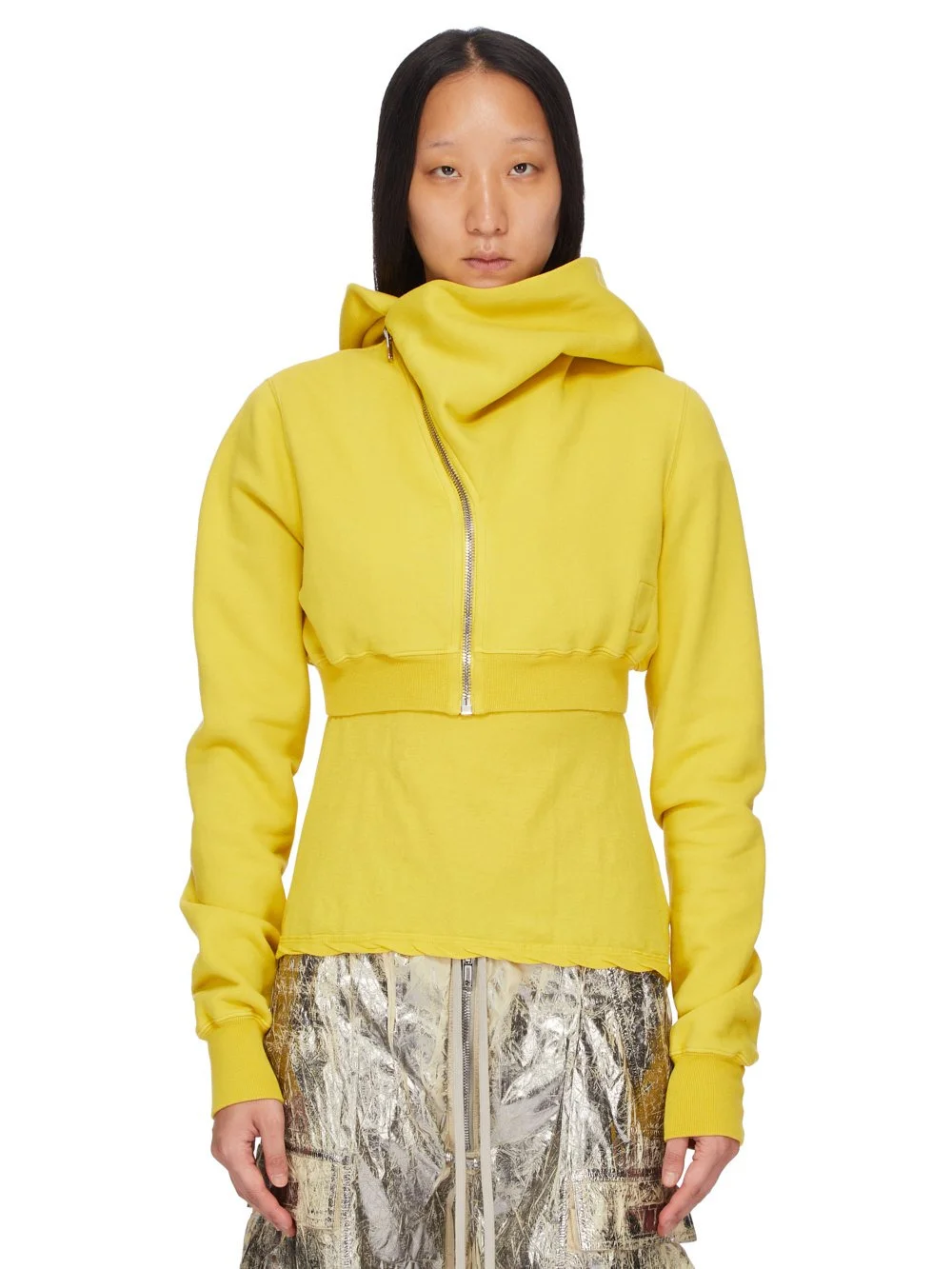 DRKSHDW FW25 CONCORDIANS MICRO MOUNTAIN HOODIE IN LEMON FURKA HEAVY SWEATSHIRT THIS MICRO MOUNTAIN HOODIE IS ABOVE WAIST LENGTH WITH LONG SLEEVES. IT HAS A CURVED ASYMMETRICAL ZIPPER CLOSURE, A SMALL FUNNEL NECK AND A LARGE POINTED HOOD. IT HAS RIBBED CUFFS AND WAISTBAND SIGNATURE SINGLE SEAM RUNNING DOWN THE CENTRE BACK SPINE. THIS HEAVYWEIGHT COTTON SWEATSHIRT JERSEY HAS A SOFT AND WASHED HANDFEEL. THIS JERSEY IS GARMENT DYED THIS FABRIC IS MADE USING GOTS CERTIFIED ORGANIC COTTON WHICH MEANS THE NATURAL FIBER IS GROWN WITHOUT HARMFUL CHEMICALS, LEAVING OUR SOIL, AIR AND WATER CLEANER FROM CONTAMINATES COLOR: LEMON MATERIAL: 100% COTTON MODEL IS 181CM TALL MODEL WEARS SIZE S