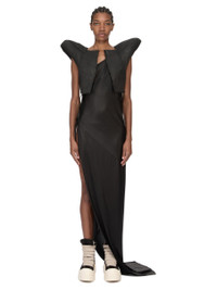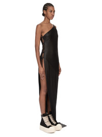 DRKSHDW SS26 TEMPLE TACO DRESS IN BLACK LIQUID JERSEY THIS TACO DRESS TRAILS FLOOR LENGTH AT BACK AND HAS AN ASYMMETRICAL NECKLINE WITH ONE THIN SHOULDER STRAP. IT FEATURES AN OPEN RIGHT SIDE BODY THAT SECURES WITH TIES ALL THE WAY DOWN TO THE HIP, REVEALING THE SIDE BODY AND LEG. ITS SKIRT TAPERS TO THE FLOOR. THIS LIGHTWEIGHT AND FLUID ACETATE JERSEY HAS A COOL AND SOFT HANDFEEL. A FINAL CINZ HEAT PRESS TREATMENT GIVES THIS JERSEY ITS SHINE. COLOR: BLACK MATERIAL: 80% ACETATE + 20% NYLON MODEL IS 181CM TALL MODEL WEARS SIZE S