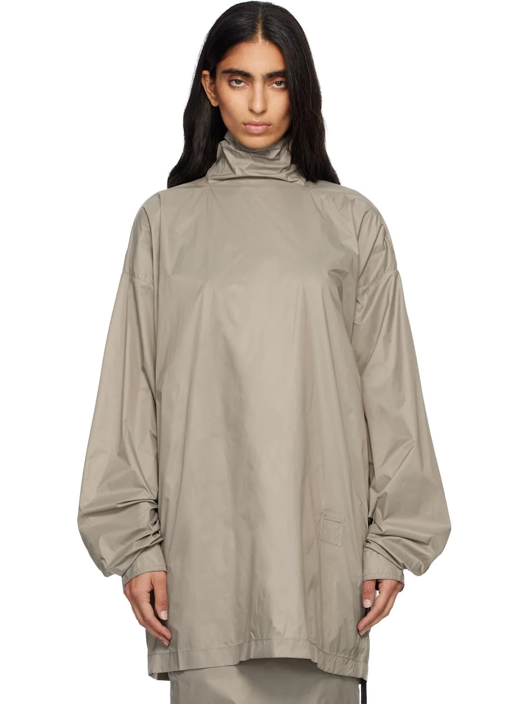 Recycled nylon satin turtleneck. · Buttoned barrel cuffs · Button closure at back collar · Integrated logo-woven strap at interior Supplier color: Dirty pearl 100% recycled polyamide. Made in Italy 252126F099000