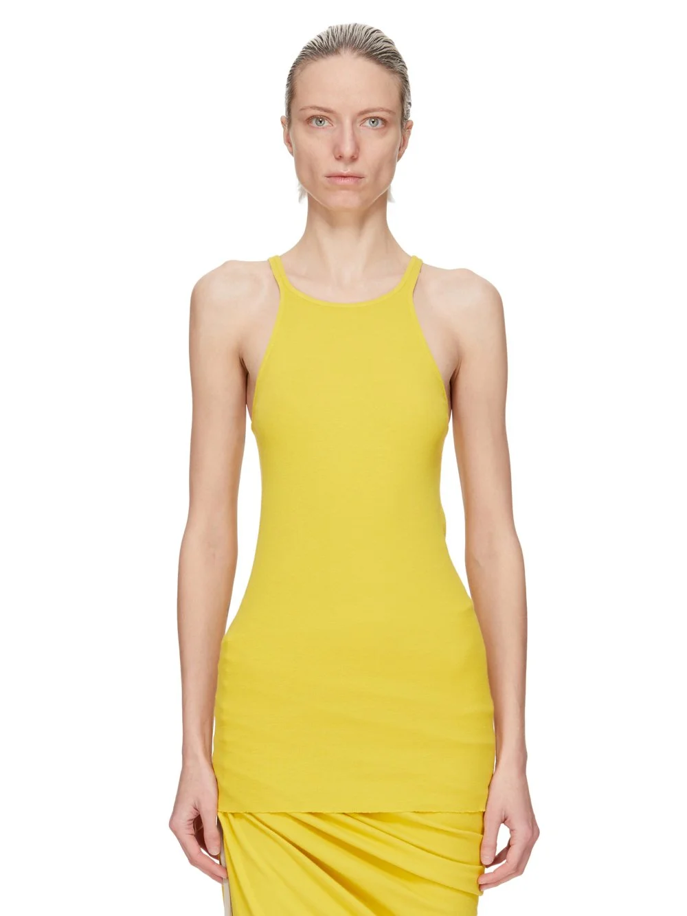 DRKSHDW FW25 CONCORDIANS RACER BACK TANK IN LEMON MEDIUM WEIGHT COTTON JERSEY THIS RACER BACK TANK IS HIP LENGTH WITH A STRAIGHT RAW CUT HEM. IT HAS A ROUND NECKLINE AND THIN SHOULDER STRAPS THAT FLOW INTO A RACER BACK. IT FEATURES THE SIGNATURE SINGLE SEAM RUNNING DOWN THE CENTRE BACK SPINE. THIS MEDIUMWEIGHT COTTON JERSEY HAS A COMPACT AND DRY HANDFEEL. THIS JERSEY IS GARMENT DYED THIS FABRIC IS MADE USING GOTS CERTIFIED ORGANIC COTTON WHICH MEANS THE NATURAL FIBER IS GROWN WITHOUT HARMFUL CHEMICALS, LEAVING OUR SOIL, AIR AND WATER CLEANER FROM CONTAMINATES COLOR: LEMON MATERIAL: 100% COTTON MODEL IS 181CM TALL MODEL WEARS SIZE S