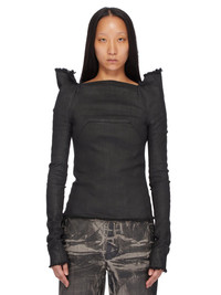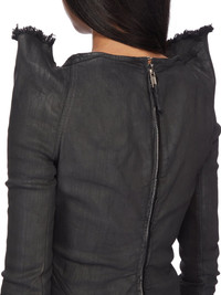 DRKSHDW FW25 CONCORDIANS TEC TOP IN BLACK WAX STRETCH DENIM THIS TEC TOP IS HIP LENGTH WITH LONG, SLIM SLEEVES AND A BODY HUGGING FIT. IT FEATURES EXAGGERATED TEC SHOULDERS WHICH RISE INTO RAW CUT POINTS AND A GEOMETRIC LINE DETAIL ON FRONT. IT CLOSES WITH A ZIPPER, WITH PULL TAB, ON CENTRE BACK. THIS LIGHTWEIGHT BLACK WAX DENIM IS MADE ON A 10OZ BLACK AND NATURAL STRETCH DENIM. THE READY GARMENT IS OVERDYED BLACK AND TREATED WITH A WAX FINISH. A FINAL WASH GIVES THIS GARMENT ITS SOFTNESS THIS GARMENT IS TREATED IN AN ITALIAN WASH HOUSE BASED IN THE VENETO AREA OF ITALY, THAT PRODUCES IN SMALLER TREATMENT BATHS TO REDUCE WATER WASTE AND UTILIZE A WATER PURIFYING PROCESS THAT ENABLES THEM TO RECYCLE A PORTION OF THE WATER USED. ALL OF OUR DENIM WASHES ARE ZDHC CERTIFIED COLOR: BLACK WAX MATERIAL: 91% COTTON + 6% ELASTOMULTIESTER + 3% RUBBER FIBER MODEL IS 181CM TALL MODEL WEARS SIZE S