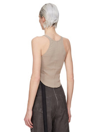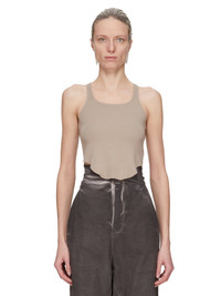 DRKSHDW FW25 CONCORDIANS BASIC RIB TANK IN DIRTY PEARL MEDIUM WEIGHT COTTON JERSEY THIS BASIC RIB TANK IS ABOVE WAIST LENGTH WITH A ROUNDED RAW CUT HEM THAT DIPS IN FRONT AND BACK. IT HAS A ROUND NECKLINE AND THIN SHOULDER STRAPS THAT FLOW INTO A SLIGHT RACER BACK. ITS BACK IS SLIGHTLY LOWER THAN THE FRONT. IT FEATURES THE SIGNATURE SINGLE SEAM RUNNING DOWN THE CENTRE BACK SPINE. THIS MEDIUMWEIGHT COTTON JERSEY HAS A COMPACT AND DRY HANDFEEL. THIS JERSEY IS GARMENT DYED THIS FABRIC IS MADE USING GOTS CERTIFIED ORGANIC COTTON WHICH MEANS THE NATURAL FIBER IS GROWN WITHOUT HARMFUL CHEMICALS, LEAVING OUR SOIL, AIR AND WATER CLEANER FROM CONTAMINATES COLOR: DIRTY PEARL MATERIAL: 100% COTTON MODEL IS 181CM TALL MODEL WEARS SIZE S