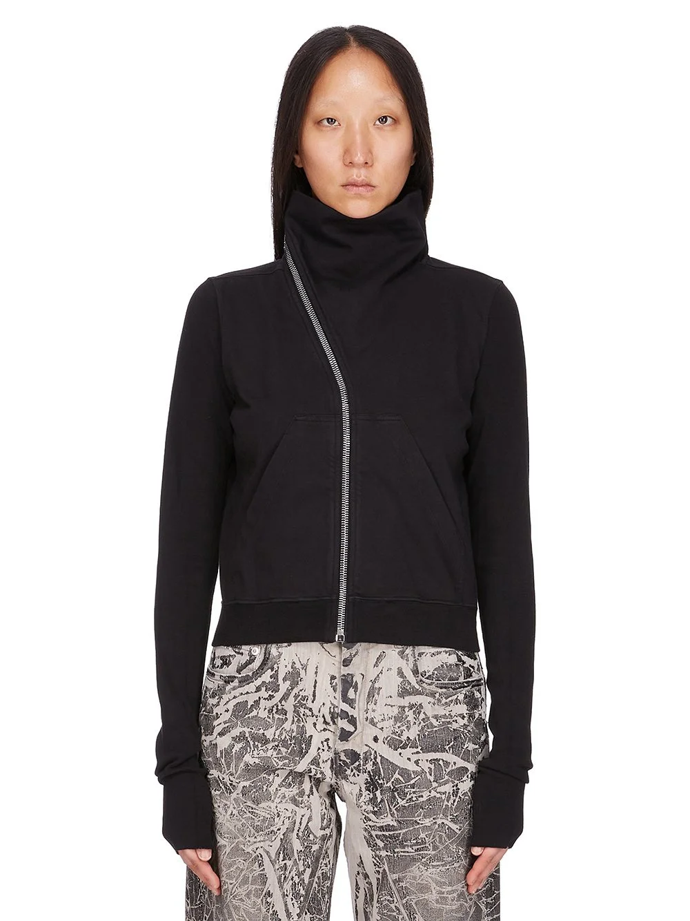 DRKSHDW FW25 CONCORDIANS MOUNTAIN SWEAT IN BLACK COMPACT HEAVY JERSEY THIS MOUNTAIN SWEAT IS BELOW WAIST LENGTH WITH LONG SLEEVES. IT HAS A CURVED ASYMMETRICAL ZIPPER CLOSURE AND A SMALL FUNNEL NECK. IT HAS TWO FRONT PATCH POCKETS, RIBBED CUFFS AND WAISTBAND SIGNATURE SINGLE SEAM RUNNING DOWN THE CENTRE BACK SPINE. THIS HEAVYWEIGHT AND COMPACT COTTON JERSEY HAS A BRUSHED AND SOFT HANDFEEL. THIS JERSEY IS GARMENT DYED. THIS FABRIC IS MADE USING GOTS CERTIFIED ORGANIC COTTON WHICH MEANS THE NATURAL FIBER IS GROWN WITHOUT HARMFUL CHEMICALS, LEAVING OUR SOIL, AIR AND WATER CLEANER FROM CONTAMINATES. COLOR: BLACK MATERIAL: 100% COTTON MODEL IS 181CM TALL MODEL WEARS SIZE S