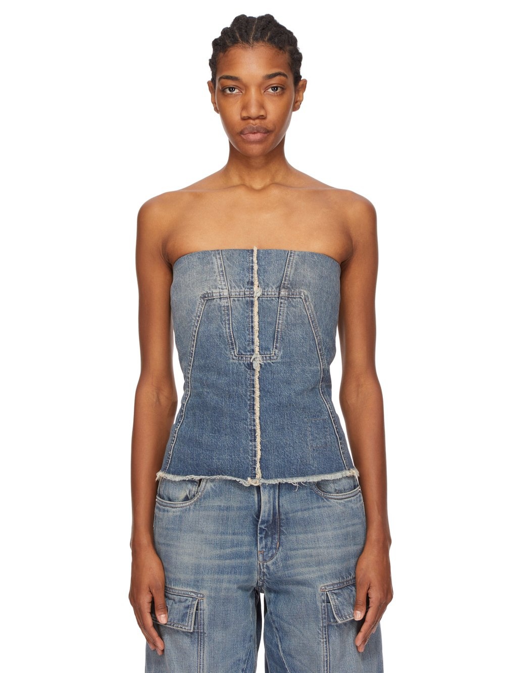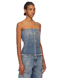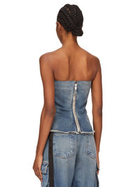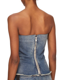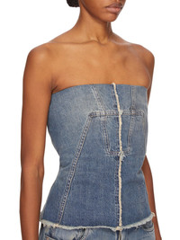 DRKSHDW SS25 HOLLYWOOD BUSTIER TOP IN WASHED INDIGO 13OZ WASHED INDIGO DENIM THIS BUSTIER TOP IS ABOVE-HIP LENGTH WITH A CLOSE TO THE BODY FIT. ITS STRAPLESS BUSTIER TOP HAS A SIGNATURE SPLINTERED MOTIVO, WITH SEAM LINES DESCENDING FROM THE NECKLINE TO A BLUNT POINT BELOW THE BUST ACROSS THE CHEST. THEY THEN SLOPE DOWN THE SIDE BODY, WRAPPING TO THE HEM. IT HAS A CENTRE BACK ZIPPER AND RAW CUT HEM THIS MEDIUMWEIGHT WASHED INDIGO DENIM IS MADE ON A 13OZ INDIGO AND NATURAL JAPANESE SELVEDGE DENIM. THE READY GARMENT IS WASHED WITH MINERALS TO ACHIEVE THE FINAL LOOK. THIS GARMENT IS TREATED IN AN ITALIAN WASH HOUSE BASED IN THE VENETO AREA OF ITALY, THAT PRODUCES IN SMALLER TREATMENT BATHS TO REDUCE WATER WASTE AND UTILIZE A WATER PURIFYING PROCESS THAT ENABLES THEM TO RECYCLE A PORTION OF THE WATER USED. ALL OF OUR DENIM WASHES ARE ZDHC CERTIFIED COLOR: WASHED INDIGO MATERIAL: 100% COTTON INNER BUSTIER 84% NYLON + 16% ELASTANE MODEL IS 181CM TALL MODEL WEARS SIZE M