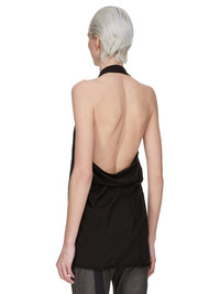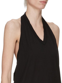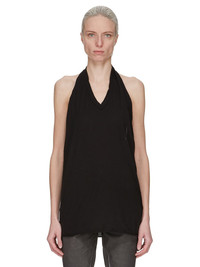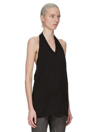 DRKSHDW SS25 HOLLYWOOD SALLY TOP IN BLACK COTTON GAUZE JERSEY THIS SALLY TOP IS BELOW HIP LENGTH WITH A LOOSE FIT. IT HAS A HALTER V NECK AND A SINGLE SEAM RUNNING DOWN THE CENTRE BACK SPINE THIS LIGHTWEIGHT AND AIRY COTTON GAUZE JERSEY IS SEMI TRANSPARENT AND HAVE A SOFT WASHED HANDFEEL. THIS JERSEY IS GARMENT DYED THIS FABRIC IS MADE USING GOTS CERTIFIED ORGANIC COTTON WHICH MEANS THE NATURAL FIBER IS GROWN WITHOUT HARMFUL CHEMICALS, LEAVING OUR SOIL, AIR AND WATER CLEANER FROM CONTAMINATES COLOR: BLACK MATERIAL: 100% COTTON MODEL IS 181CM TALL MODEL WEARS SIZE S