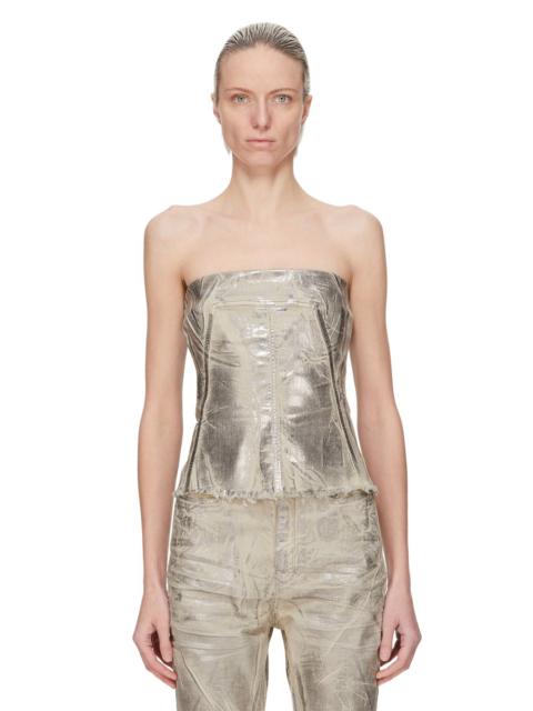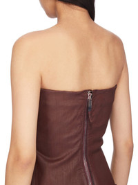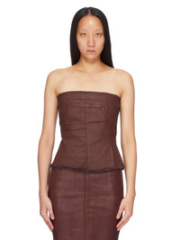 DRKSHDW FW25 CONCORDIANS BUSTIER TOP IN SCAB WAX STRETCH DENIM THIS BUSTIER TOP IS ABOVE-HIP LENGTH WITH A CLOSE TO THE BODY FIT. ITS STRAPLESS BUSTIER TOP HAS SEAM LINES ACROSS THE CHEST AND SLOPING DOWN THE SIDE BODY WRAPPING TO THE HEM. IT HAS A CENTRE BACK ZIPPER WITH PULL TAB AND A RAW CUT HEM. THIS LIGHTWEIGHT SCAB WAX DENIM IS MADE ON A 10OZ INDIGO AND NATURAL STRETCH DENIM. THE READY GARMENT IS OVERDYED SCAB AND TREATED WITH A WAX FINISH. A FINAL WASH GIVES THIS GARMENT ITS SOFTNESS THIS GARMENT IS TREATED IN AN ITALIAN WASH HOUSE BASED IN THE VENETO AREA OF ITALY, THAT PRODUCES IN SMALLER TREATMENT BATHS TO REDUCE WATER WASTE AND UTILIZE A WATER PURIFYING PROCESS THAT ENABLES THEM TO RECYCLE A PORTION OF THE WATER USED. ALL OF OUR DENIM WASHES ARE ZDHC CERTIFIED COLOR: SCAB WAX MATERIAL: 91% COTTON + 6% ELASTOMULTIESTER + 3% RUBBER FIBER MODEL IS 181CM TALL MODEL WEARS SIZE S
