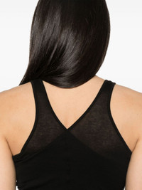 black organic cotton jersey texture semi-sheer construction layered design asymmetric neck unlined straight hem This item is made from at least 50% organic materials. Learn more about what makes a product Conscious on our Conscious Criteria page Size & Fit Model Measurements: Height: 1.79 m Bust/Chest: 84.0 cm Hips: 91.0 cm Waist: 62.0 cm Model wears size S Fabric and Care Designer Style ID: DS01D1106BH Designer Colour: 09 BLACK Composition: Organic cotton 100% Washing instructions: Hand Wash Made in Italy