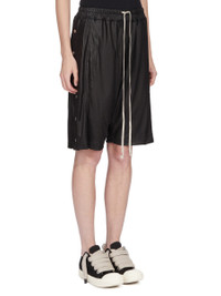 DRKSHDW SS26 TEMPLE WIDE PUSHER SHORTS IN BLACK LIQUID JERSEY THESE WIDE PUSHER SHORTS ARE KNEE LENGTH WITH AN AMPLE LEG AND A SLIGHTLY DROPPED CROTCH. THEY HAVE AN ELASTICIZED WAISTBAND WITH DRAWSTRING, SIDE FRONT JET POCKETS AND SQUARE BACK POCKETS WITH TOPSTITCHING. THEY FEATURE VISIBLE SNAP CLOSURES RUNNING DOWN THE OUTER LEG ALLOWING THEM TO BE UNSNAPPED AND WORN OPEN. THIS LIGHTWEIGHT AND FLUID ACETATE JERSEY HAS A COOL AND SOFT HANDFEEL. A FINAL CINZ HEAT PRESS TREATMENT GIVES THIS JERSEY ITS SHINE. COLOR: BLACK MATERIAL:80% ACETATE + 20% NYLON MODEL IS 181CM TALL MODEL WEARS SIZE S
