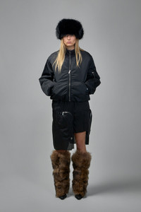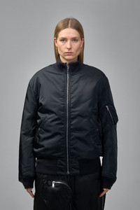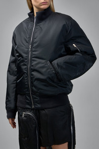 Bomber jacket with a boxy, slightly cropped silhouette and shiny black nylon exterior. Features a central silver metal zip, ribbed high collar, cuffs and hem, slanted flap pockets with snap buttons and a zipped utility pocket on the left sleeve. Materials: 100% Cotton Color: black SKU: 152584 Brand style: DL02E2794-NYJP-09 Size and Fit The model is 1.76m (5.8ft) and wears a size M. The item has a looser cut but is not necessarily oversized. It’s intended for a comfortable and easy wear.
