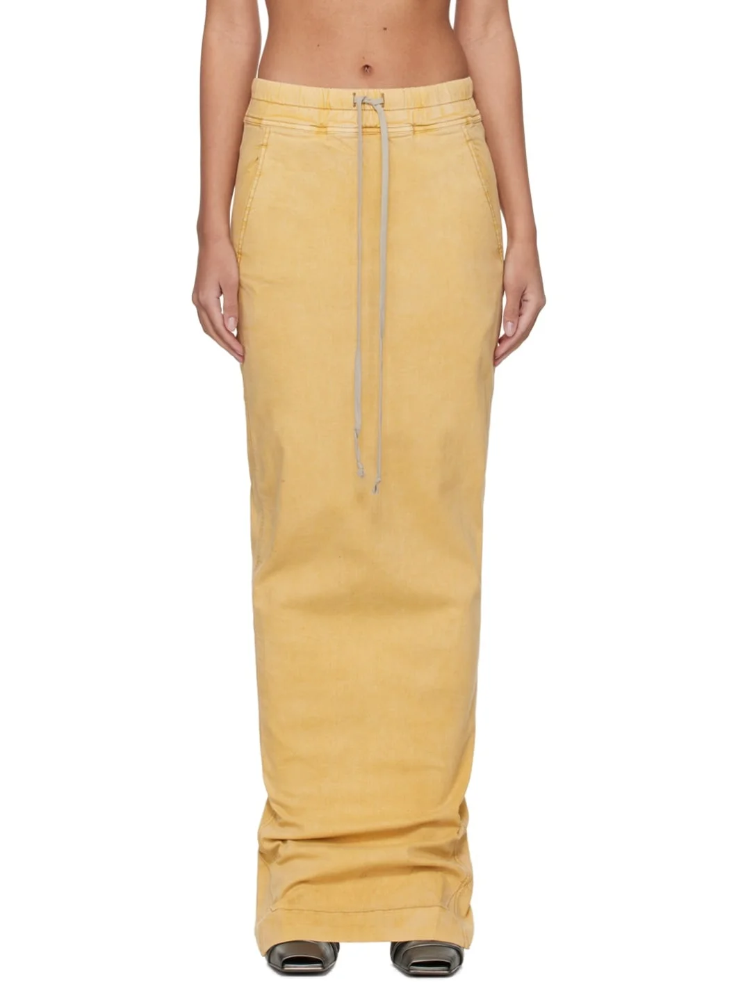 ZDHC-certified overdyed coated stretch denim skirt. Fading and draping throughout. · Drawstring at elasticized waistband · Two-pocket styling · Vent at back hem Supplier color: Mustard Body: 90% cotton, 7% polyester, 3% rubber. Lining: 100% cotton. Made in Italy 241126F093018