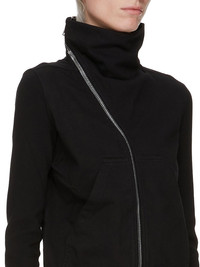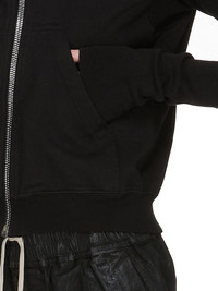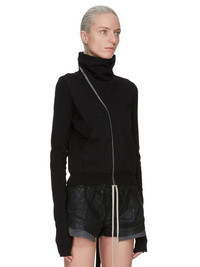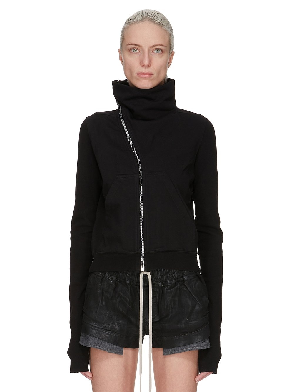 DRKSHDW SS25 HOLLYWOOD MOUNTAIN SWEAT IN BLACK COMPACT HEAVY COTTON JERSEY THIS MOUNTAIN SWEAT IS BELOW WAIST LENGTH WITH LONG SLEEVES. IT HAS A CURVED ASYMMETRICAL ZIPPER CLOSURE AND A SMALL FUNNEL NECK. IT HAS TWO FRONT PATCH POCKETS, RIBBED CUFFS AND WAISTBAND SIGNATURE SINGLE SEAM RUNNING DOWN THE CENTRE BACK SPINE THIS HEAVYWEIGHT AND COMPACT COTTON JERSEY HAS A BRUSHED AND SOFT HANDFEEL. THIS JERSEY IS GARMENT DYED. THIS FABRIC IS MADE USING GOTS CERTIFIED ORGANIC COTTON WHICH MEANS THE NATURAL FIBER IS GROWN WITHOUT HARMFUL CHEMICALS, LEAVING OUR SOIL, AIR AND WATER CLEANER FROM CONTAMINATES COLOR: BLACK MATERIAL: 100% COTTON MODEL IS 181CM TALL MODEL WEARS SIZE S
