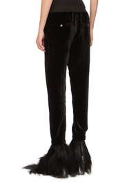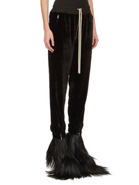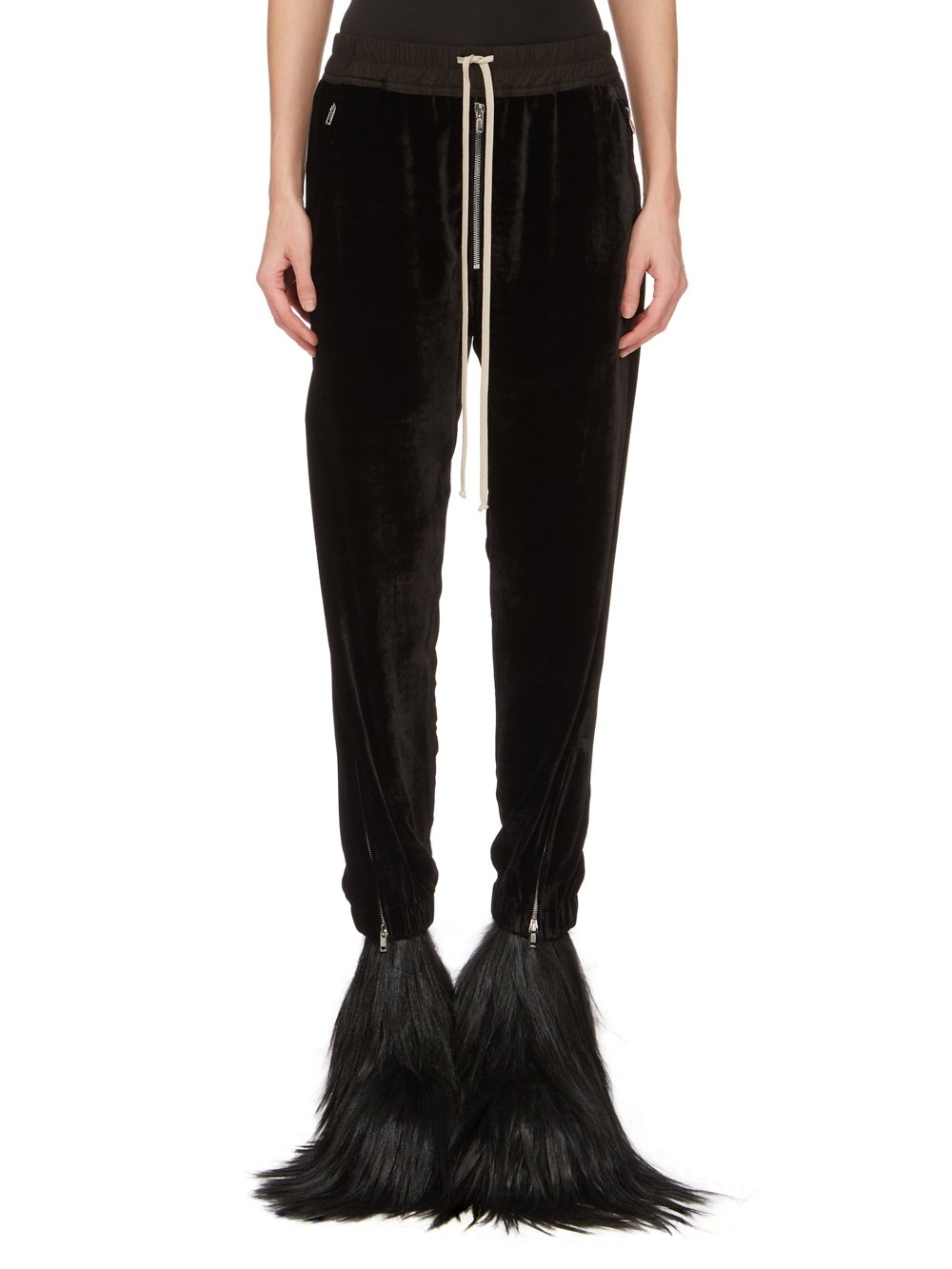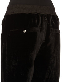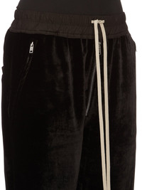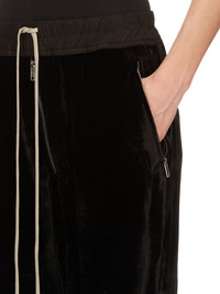 RICK OWENS FW24 PORTERVILLE TRACK IN BLACK VELVET THESE TRACK PANTS ARE FULL-LENGTH WITH A SLIGHTLY DROPPED CROTCH. THEY HAVE AN ELASTICIZED WAISTBAND WITH DRAWSTRING, AND AN EXPOSED ZIPPER FLY. THEY FEATURE TWO SIDE JET POCKETS WITH ZIPPERS, TWO BACK WELT POCKETS WITH SNAPS, AND ELASTICIZED HEMS WITH ZIPPER OPENINGS ON THE OUTER ANKLES THIS LIGHTWEIGHT AND FLUID VELVET HAS A SOFT AND WASHED UNEVEN FINISH. THIS FABRIC IS MADE FROM FSC® CERTIFIED VISCOSE WHICH ENSURES THAT THE FIBERS ARE PRODUCED FROM RESPONSIBLY MANAGED SOURCES AND NO DEFORESTATION OCCURS - COLOR: BLACK - MATERIAL: 82% VISCOSE + 18% SILK - BAND 100% COTTON - MODEL IS 181CM TALL - MODEL WEARS SIZE 40