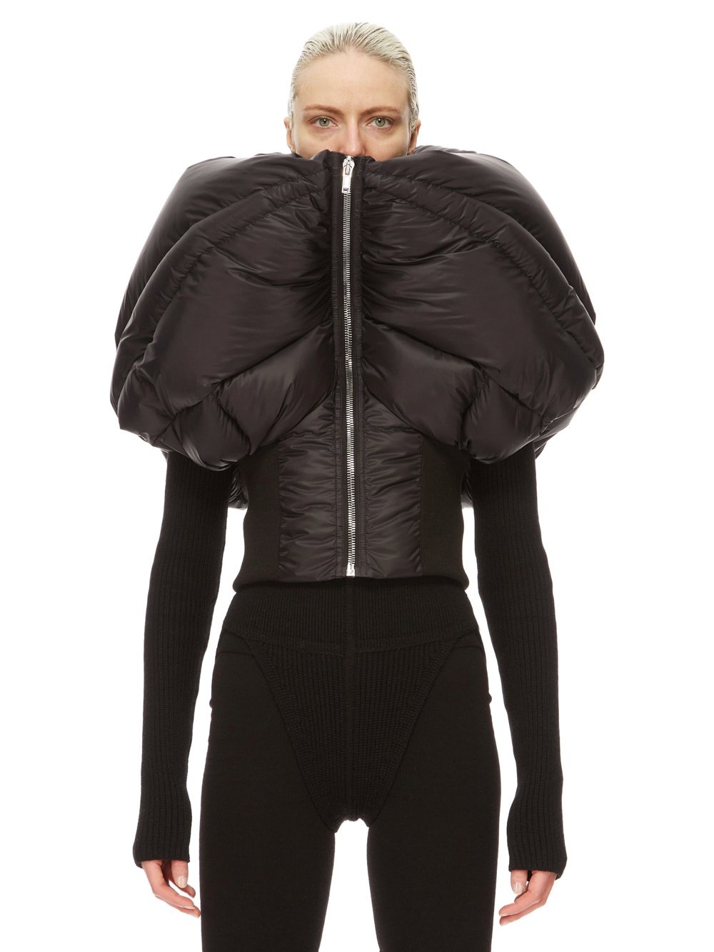 RICK OWENS FW24 PORTERVILLE MINI HORUS SL JKT IN BLACK RECYCLED NYLON THIS MINI HORUS SL JKT IS WAIST LENGTH AND SLEEVELESS. IT IS A HEAVYWEIGHT DUVET, WITH A CENTRE FRONT ZIPPER AND A THICK KNIT WAISTBAND. IT IS QUILTED, WITH STITCHING LINES FRONT AND BACK, THAT WRAP THE BODY, AND FINISH IN A POINT, CREATING A VOLUME THAT RISES BEHIND THE HEAD, AROUND THE SHOULDERS AND PROTRUDES BELOW THE CHIN AT THE CENTRE FRONT. OR IT CAN FALL OPEN, TO CREATE A WINGED SHAPE WHEN OPEN. THIS AIRY AND LIGHTWEIGHT NYLON IS MADE USING GRS CERTIFIED RECYCLED NYLON WHICH ENSURES A REDUCTION IN WATER CONSUMPTION, EMISSIONS AND HAZARDOUS WASTE, LESSENING THE DEPENDENCE ON NON-RENEWABLE RESOURCES - COLOR: BLACK - MATERIAL: 100% NYLON - KNIT RIB BOTTOM 100% NEW WOOL - PADDING 90% GOOSE DOWN + 10% MALLARD FEATHERS - MODEL IS 181CM TALL - MODEL WEARS SIZE 40