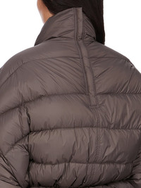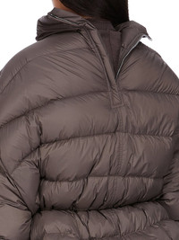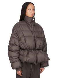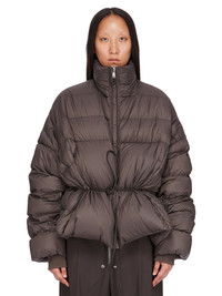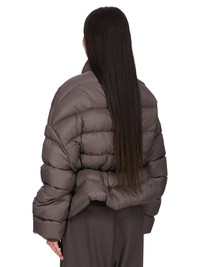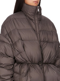 RICK OWENS FW25 CONCORDIANS SAIL DUVET IN DARKDUST LIGHT NYLON THIS SAIL DUVET IS HIP LENGTH WITH A VOLUMINOUS FIT. IT HAS WIDE SHOULDERS WHICH FALL INTO LONG SLEEVES, AND A CENTRE FRONT OPENING WITH CONCEALED SNAPS AND A HIGH NECK. IT FEATURES A STITCHED WAISTBAND WITH INNER CORD WHICH CAN PULL THE JACKET IN, TO GATHER AT THE WAIST AND CREATE A PEPLUM SHAPEIT HAS TWO INNER ZIPPERED POCKETS THIS AIRY AND LIGHTWEIGHT NYLON IS MADE USING GRS CERTIFIED RECYCLED NYLON WHICH ENSURES A REDUCTION IN WATER CONSUMPTION, EMISSIONS AND HAZARDOUS WASTE, LESSENING THE DEPENDENCE ON NON-RENEWABLE RESOURCES COLOR: DARKDUSTMATERIAL: 100% NYLON BELT 100% BULL LEATHER KNIT RIB CUFF 100% NEW WOOL INSIDE POCKETS 97% COTTON + 3% ELASTANE PADDING 90% GOOSE DOWN + 10% MALLARD FEATHERS MODEL IS 181CM TALL ITEM IS AVAILABLE IN ONE SIZE