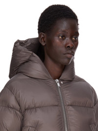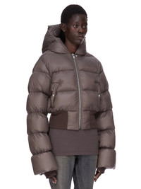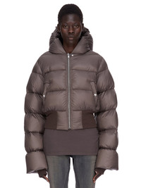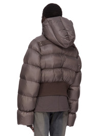 RICK OWENS FW25 CONCORDIANS HOODED JKT IN DARKDUST LIGHT NYLON THIS HOODED JKT IS CROPPED BELOW THE WAIST WITH A CENTRE FRONT ZIPPER, WITH TOP SNAP CLOSURE AND A HOOD. IT IS PADDED AND QUILTED WITH HORIZONTAL STITCHING LINES AND HAS SIDE FRONT WELT POCKETS WITH SNAPS, A WIDE RIBBED WAISTBAND RIBBED WRISTS. IT FEATURES A SIGNATURE COTTON WEBBING STRAP, WITH RIVET DETAIL, ACROSS THE BACK YOKE THIS AIRY AND LIGHTWEIGHT NYLON IS MADE USING GRS CERTIFIED RECYCLED NYLON WHICH ENSURES A REDUCTION IN WATER CONSUMPTION, EMISSIONS AND HAZARDOUS WASTE, LESSENING THE DEPENDENCE ON NON-RENEWABLE RESOURCES COLOR: DARKDUST MATERIAL: 100% NYLON KNIT RIB BOTTOM AND CUFFS 100% NEW WOOL POCKETS LINING 100% COTTON PADDING 90% GOOSE DOWN + 10% MALLARD FEATHERS MODEL IS 181CM TALL MODEL WEARS SIZE 40
