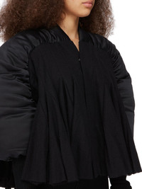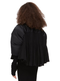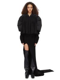 RICK OWENS FW23 LUXOR RUNWAY DUVETESSA CROPPED IN BLACK SILK CHARMEUSE AND SOFT WOOL FLANNEL THIS DUVETESSA CROPPED IS ABOVE HIP LENGTH. IT HAS A V-NECK AND A CENTRE FRONT OPENING WITH CONCEALED SNAPS. IT FEATURES PUFFED DUVET SHOULDERS THAT EXTEND TO THE ELBOW, WITH EXTRA LONG RIB SLEEVES. THE BODY IS CREATED FROM MULTIPLE PANELS OF FABRIC THAT START AS GEOMETRIC SEAM LINES AT THE ROUNDED YOKE SEAM, AND SWELL OUT WITH WIDE GODETS, CREATING A VOLUMINOUS A-SHAPE. IT IS UNLINED THIS ITEM CONTAINS A MIX OF GOOSE DOWN AND MALLARD DUCK DOWN, PLEASE CHECK FOR ANY LOCAL IMPORT RESTRICTIONS OR TAXES FOR YOUR COUNTRY THIS IS A COMBINATION OF SILK CHARMEUSE AND SOFT WOOL FLANNEL THIS MEDIUMWEIGHT FLUID SILK CHARMEUSE HAS A SOFT ENZYME FINISH. IT IS WOVEN IN THE COMO REGION OF ITALY KNOWN FOR ITS HERITAGE OF SILK PRODUCTION - COLOR: BLACK - MATERIAL: BODY 100% NEW WOOL - SLEEVES + YOKE 100% SILK - KNIT RIB ARM WARMERS 97% CASHMERE + 3% WOOL - YOKE AND SLEEVES LINING 97% COTTON + 3% ELASTANE - YOKE AND SLEEVES PADDING 90% GOOSE DOWN + 10% MALLARD FEATHERS - MODEL IS WEARING SIZE 40 - MODEL IS 181 CM TALL