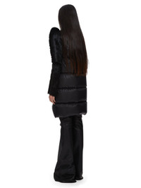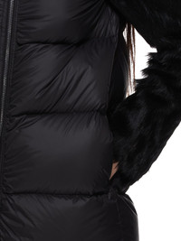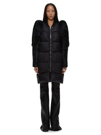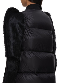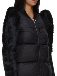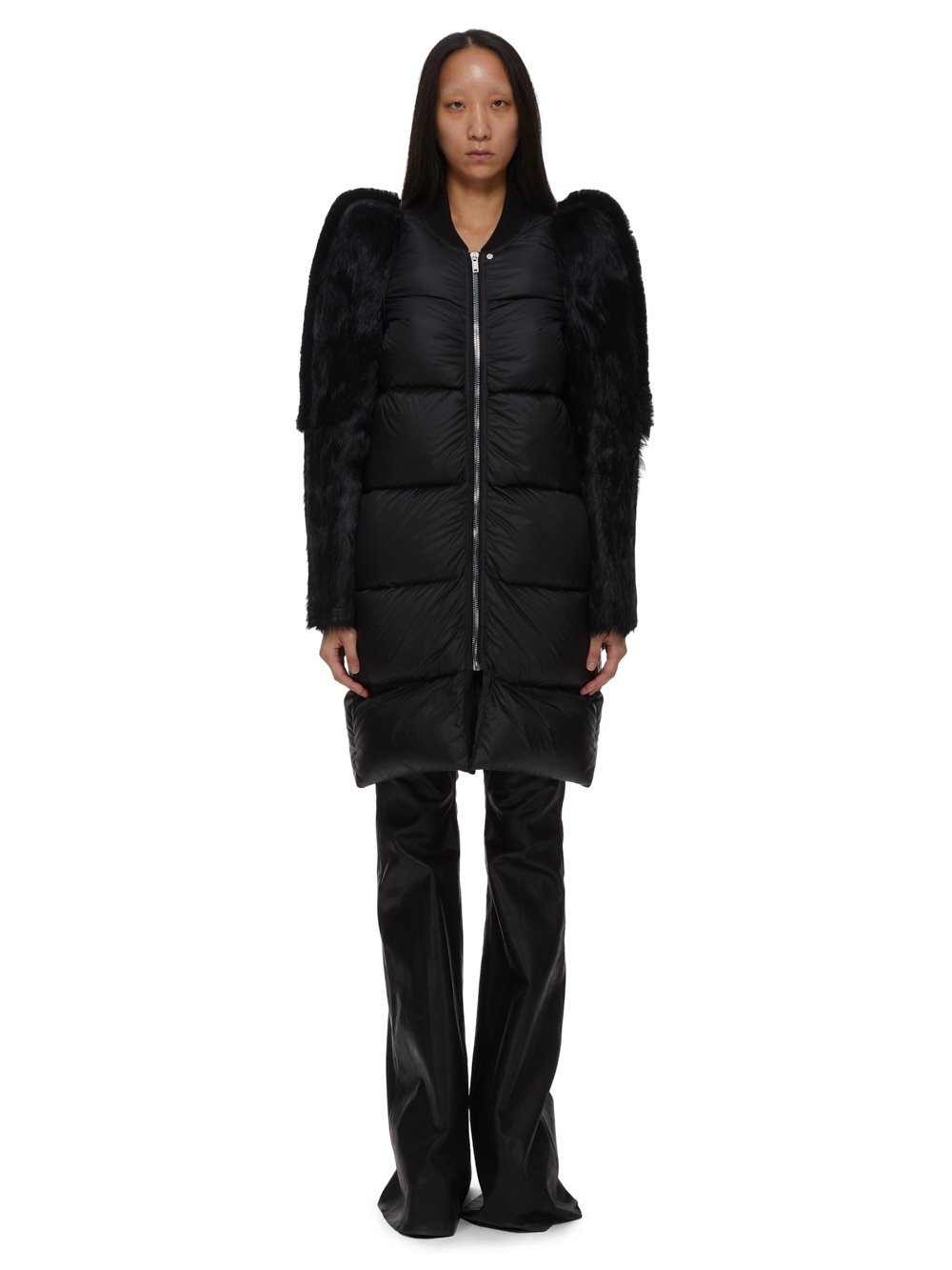 RICK OWENS FW23 LUXOR METRO FLANGED PEA IN BLACK RECYCLED NYLON, LONG HAIR PONY AND GOAT FUR THIS METRO FLANGED PEA IS KNEE LENGTH WITH A CENTRE FRONT ZIPPER WITH PLACKET, TOP SNAP AND RIBBED BOMBER NECK. IT HAS ROUNDED METRO SHOULDERS WITH A FLANGED INSERT OF LONG HAIR PONY, LONG SLIM SLEEVES WITH SLIT CUFFS AND A DUVET BODY WITH HORIZONTAL STITCHING LINES THIS IS A COMBINATION OF RECYCLED NYLON, LONG HAIR PONY AND GOAT THIS AIRY AND LIGHTWEIGHT NYLON IS MADE USING GRS CERTIFIED RECYCLED NYLON WHICH ENSURES A REDUCTION IN WATER CONSUMPTION, EMISSIONS AND HAZARDOUS WASTE, LESSENING THE DEPENDENCE ON NON-RENEWABLE RESOURCES - COLOR: BLACK - MATERIAL: 100% NYLON - SLEEVES 100% COW REAL FUR - SLEEVES DETAIL 100% GOAT FUR - SLEEVES INTERNAL DETAIL 100% CALF LEATHER - KNIT RIB COLLAR 100% NEW WOOL - SLEEVES LINING 100% CUPRO - POCKETS LINING 100% - MODEL IS WEARING SIZE 40 - MODEL IS 181 CM TALL