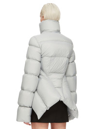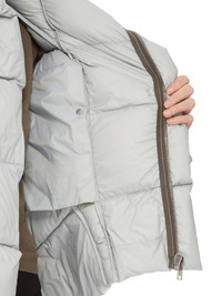 RICK OWENS FW24 PORTERVILLE NASKA DUVET IN PALE BLUE RECYCLED NYLON THIS NASKA DUVET IS ABOVE HIP-LENGTH. IT IS A MID-WEIGHT DUVET WITH HORIZONTAL AND VERTICAL QUILTING LINES. IT FEATURES A DOUBLE BREASTED FRONT WITH ZIPPER CLOSURE, CREATING A FLAP. IT CAN BE WORN DRAPED OPEN, HALF-CLOSED AS A WIDE COLLAR OR FULLY ZIPPERED UP TO CREATE A HIGH FUNNEL NECK. IT HAS LONG SLIM SLEEVES AND A CURVED NASKA HEMLINE THAT DIPS INTO TWO POINTS AT THE BACK THIS AIRY AND LIGHTWEIGHT NYLON IS MADE USING GRS CERTIFIED RECYCLED NYLON WHICH ENSURES A REDUCTION IN WATER CONSUMPTION, EMISSIONS AND HAZARDOUS WASTE, LESSENING THE DEPENDENCE ON NON-RENEWABLE RESOURCES - COLOR: PALE BLUE - MATERIAL: 100% NYLON - KNIT RIB CUFF 100% NEW WOOL - PADDING 90% GOOSE DOWN + 10% MALLARD FEATHERS - MODEL IS 181CM TALL - MODEL WEARS SIZE 40