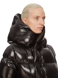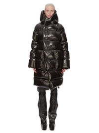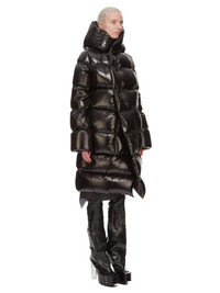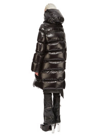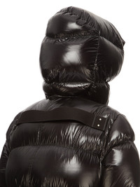 RICK OWENS FW24 PORTERVILLE LS HOODED LINER IN BLACK LACQUE NYLON THIS LS HOODED LINER IS KNEE-LENGTH, WITH LONG SLEEVES AND A HOOD. IT IS A HEAVYWEIGHT DUVET, QUILTED WITH HORIZONTAL STITCHING LINES. IT CLOSES WITH FOUR CONCEALED SNAP CLOSURES ON THE FRONT CHEST AND HAS TWO SIDE SEAM POCKETS. IT FEATURES A SIGNATURE COTTON WEBBING STRAP, WITH RIVET DETAIL, ACROSS THE BACK YOKEIT HAS TWO INTERNAL ZIPPERED POCKETS THIS AIRY AND LIGHTWEIGHT NYLON HAS A FINAL CINZ FINISH THAT CREATE THE LACQUERED EFFECT. - COLOR: BLACK - MATERIAL: 100% NYLON - KNIT RIB CUFF 100% NEW WOOL - INSIDE POCKETS 97% COTTON + 3% ELASTANE - PADDING 90% GOOSE DOWN + 10% MALLARD FEATHERS - MODEL IS 181CM TALL - MODEL WEARS SIZE 40