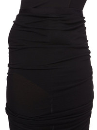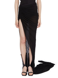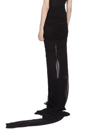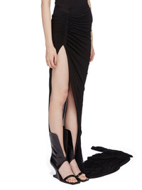 RICK OWENS SS25 HOLLYWOOD EDFU SKIRT IN BLACK VISCOSE CREPE JERSEY THIS JERSEY EDFU SKIRT TRAILS FLOOR-LENGTH AND HAS A LONG TRAIN. IT HAS AN ELASTICIZED WAISTBAND A TIGHT FIT. IT DRAPES AND WRAPS AROUND THE HIPS, AND GATHERS INTO A SEAM ON THE RIGHT THIGH. IT OPENS TO A HIGH SPLIT AND TAPERS TO A NARROW, FLOOR TRAILING TIP THIS LIGHTWEIGHT AND FLUID JERSEY IS SEMI-TRANSPARENT WITH A DRY CREPE HANDFEEL. THIS JERSEY IS MADE FROM FSC® CERTIFIED VISCOSE WHICH ENSURES THAT THE FIBERS ARE PRODUCED FROM RESPONSIBLY MANAGED SOURCES AND NO DEFORESTATION OCCURS COLOR: BLACK MATERIAL: 100% VISCOSE MODEL IS 181CM TALL MODEL WEARS SIZE 40