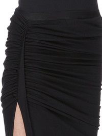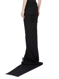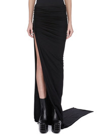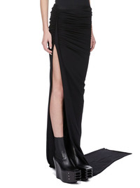 RICK OWENS SS25 HOLLYWOOD EDFU SKIRT IN BLACK CLASSIC COTTON JERSEY THIS JERSEY EDFU SKIRT TRAILS FLOOR-LENGTH AND HAS A LONG TRAIN. IT HAS AN ELASTICIZED WAISTBAND A TIGHT FIT. IT DRAPES AND WRAPS AROUND THE HIPS, AND GATHERS INTO A SEAM ON THE RIGHT THIGH. IT OPENS TO A HIGH SPLIT AND TAPERS TO A NARROW, FLOOR TRAILING TIP THIS MEDIUMWEIGHT CLASSIC COTTON JERSEY IS COMPACT WITH A DRY HANDFEEL. THIS JERSEY IS MADE USING GOTS CERTIFIED ORGANIC COTTON WHICH MEANS THE NATURAL FIBER IS GROWN WITHOUT HARMFUL CHEMICALS, LEAVING OUR SOIL, AIR AND WATER CLEANER FROM CONTAMINATES WE STRIVE TO KEEP OUR PRODUCTION AS LOCAL AS POSSIBLE. THE FULL MANUFACTURING CYCLE OF THIS PRODUCT, FROM THE MATERIAL KNITTING TO SEWING AND FINISHING, WAS UNDERTAKEN CLOSE TO OUR HOME BASE IN CONCORDIA, ITALY. COLOR: BLACK MATERIAL: 100% COTTON MODEL IS 181CM TALL MODEL WEARS SIZE 40