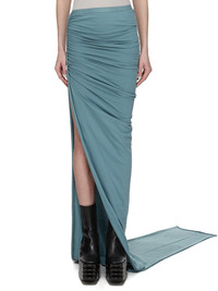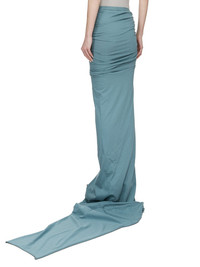 RICK OWENS SS25 HOLLYWOOD EDFU SKIRT IN MOUTHWASH CLASSIC COTTON JERSEY THIS JERSEY EDFU SKIRT TRAILS FLOOR-LENGTH AND HAS A LONG TRAIN. IT HAS AN ELASTICIZED WAISTBAND A TIGHT FIT. IT DRAPES AND WRAPS AROUND THE HIPS, AND GATHERS INTO A SEAM ON THE RIGHT THIGH. IT OPENS TO A HIGH SPLIT AND TAPERS TO A NARROW, FLOOR TRAILING TIP THIS MEDIUMWEIGHT CLASSIC COTTON JERSEY IS COMPACT WITH A DRY HANDFEEL. THIS JERSEY IS MADE USING GOTS CERTIFIED ORGANIC COTTON WHICH MEANS THE NATURAL FIBER IS GROWN WITHOUT HARMFUL CHEMICALS, LEAVING OUR SOIL, AIR AND WATER CLEANER FROM CONTAMINATES WE STRIVE TO KEEP OUR PRODUCTION AS LOCAL AS POSSIBLE. THE FULL MANUFACTURING CYCLE OF THIS PRODUCT, FROM THE MATERIAL KNITTING TO SEWING AND FINISHING, WAS UNDERTAKEN CLOSE TO OUR HOME BASE IN CONCORDIA, ITALY. COLOR: MOUTHWASH MATERIAL: 100% COTTON MODEL IS 181CM TALL MODEL WEARS SIZE 40