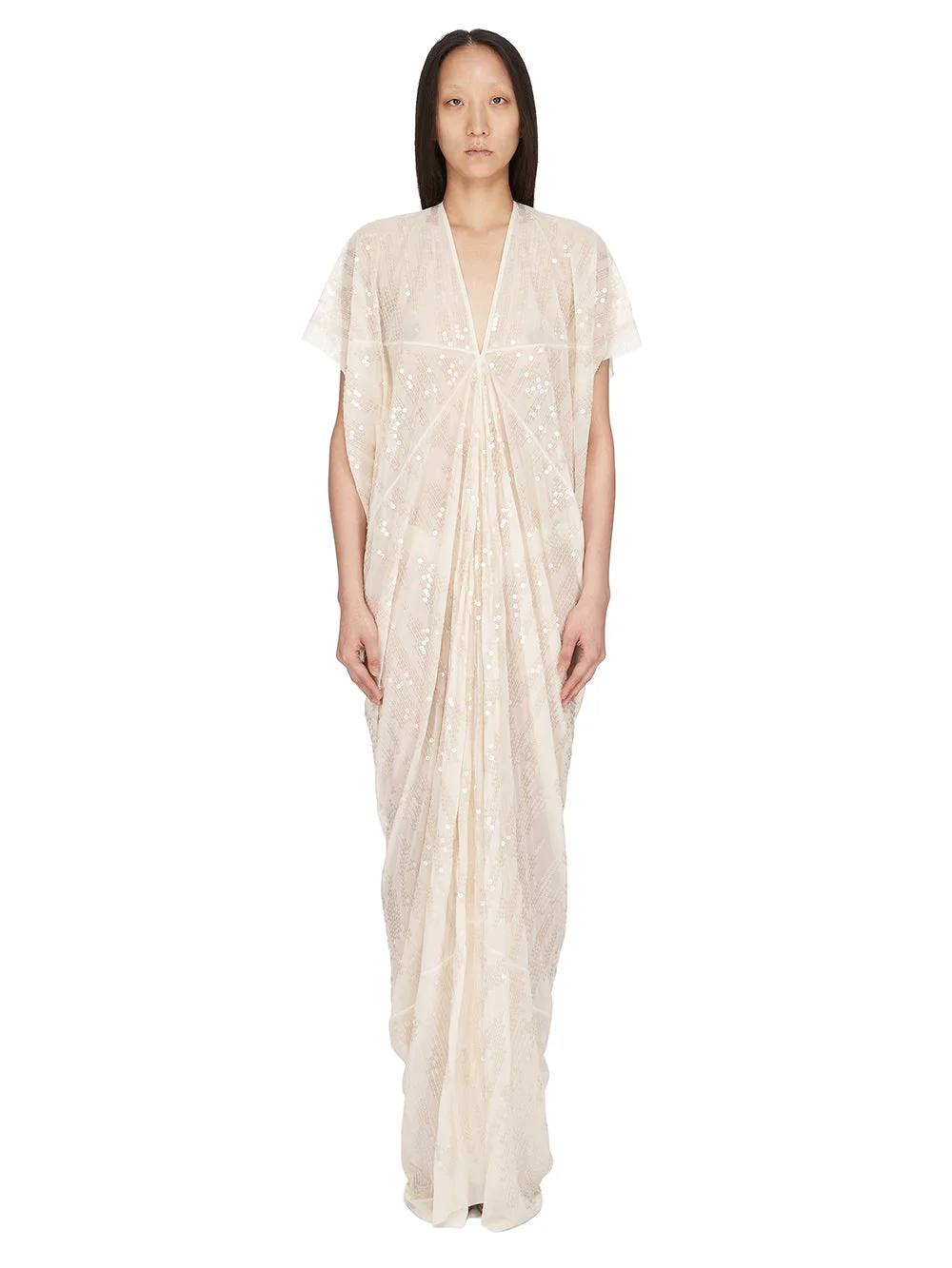 RICK OWENS SS26 TEMPLE EM GOWN IN BUTTER/TRANSPARENT EMBROIDERED STRETCH TULLE THIS EM GOWN IS FLOOR LENGTH FRONT AND BACK. IT HAS SHORT SLEEVES, A V NECK AND FEATURES CENTRE FRONT DRAPING GATHERED INTO A SEAM COMING TO A POINT BETWEEN THE BUST. IT HAS A SLIMMING FIT, WITH A SOFTLY DRAPING BACK. THIS LIGHTWEIGHT AND SHEER NYLON STRETCH TULLE HAS A SOFT HANDFELL. THIS FABRIC IS MADE USING GRS CERTIFIED RECYCLED POLYAMIDE WHICH ENSURES A REDUCTION IN WATER CONSUMPTION, EMISSIONS AND HAZARDOUS WASTE, LESSENING THE DEPENDENCE ON NON-RENEWABLE RESOURCES. COLOR: BUTTER/TRANSPARENT MATERIAL:93% NYLON + 7% ELASTANE EMBROIDERY 100% POLYESTER MODEL IS 181CM TALL MODEL WEARS SIZE 40