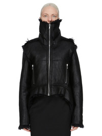 RICK OWENS FW25 CONCORDIANS EXPLODER JKT IN BLACK TOSCANA SHEARLING THIS EXPLODER JKT IS BELOW WAIST LENGTH IN FRONT AND LONGER IN THE BACK. IT HAS LONG SLEEVES WITH ZIPPERED WRISTS AND A CENTRE FRONT ZIPPER THAT CLOSES ALL THE WAY UP OVER THE NOSE. IT CAN BE WORN CLOSED OR OPEN, CREATING A WIDE LAPEL. IT FEATURES A CURVED, SLIGHTLY LIFTED, FRONT HEM THAT ENDS IN POINTS AT THE SIDES AND HAS TWO FRONT SIDE ZIPPERED POCKETS ON THE LEATHER SIDE. THIS VERSION HAS SOFT LONG, CURLY FUR ON THE INSIDE, AND SIDE SEAMS, AND IS COMPLETELY REVERSIBLE THIS MEDIUMWEIGHT SHEARLING LAMB LEATHER HAS A WAXY NAPPA FINISH AND A SOFT, LONG AND CURLY FUR TANNED IN THE TUSCANY AREA OF ITALY, THESE SHEARLING HIDES ARE OF NORTH SPANISH ORIGIN. THE SPECIFIC CURLY AND LONG HAIR TEXTURE IS ONLY FOUND IN THE BURGOS REGION OF SPAIN. BECAUSE THE HAIR IS NATURAL, THERE WILL BE VARIATIONS IN HAIR LENGTH AND TEXTURE, MAKING EACH PIECE UNIQUE THIS TANNERY IS LWG CERTIFIED WITH A SILVER RATING COLOR: BLACK MATERIAL: 100% LAMB SHEARLING REAL FUR ZIPPER EDGE + POCKETS DETAIL 100% CALF LEATHER POCKETS LINING 100% COTTON MODEL IS 181CM TALL MODEL WEARS SIZE 40