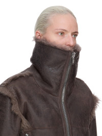 RICK OWENS FW25 CONCORDIANS EXPLODER JKT IN DARKDUST TOSCANA SHEARLING THIS EXPLODER JKT IS BELOW WAIST LENGTH IN FRONT AND LONGER IN THE BACK. IT HAS LONG SLEEVES WITH ZIPPERED WRISTS AND A CENTRE FRONT ZIPPER THAT CLOSES ALL THE WAY UP OVER THE NOSE. IT CAN BE WORN CLOSED OR OPEN, CREATING A WIDE LAPEL. IT FEATURES A CURVED, SLIGHTLY LIFTED, FRONT HEM THAT ENDS IN POINTS AT THE SIDES AND HAS TWO FRONT SIDE ZIPPERED POCKETS ON THE LEATHER SIDE. THIS VERSION HAS SOFT LONG, CURLY FUR ON THE INSIDE, AND SIDE SEAMS, AND IS COMPLETELY REVERSIBLE. THIS MEDIUMWEIGHT SHEARLING LAMB LEATHER HAS A WAXY NAPPA FINISH AND A SOFT, LONG AND CURLY FUR. TANNED IN THE TUSCANY AREA OF ITALY, THESE SHEARLING HIDES ARE OF NORTH SPANISH ORIGIN. THE SPECIFIC CURLY AND LONG HAIR TEXTURE IS ONLY FOUND IN THE BURGOS REGION OF SPAIN. BECAUSE THE HAIR IS NATURAL, THERE WILL BE VARIATIONS IN HAIR LENGTH AND TEXTURE, MAKING EACH PIECE UNIQUE. THIS TANNERY IS LWG CERTIFIED WITH A SILVER RATING. COLOR: DARKDUST MATERIAL: 100% LAMB SHEARLING REAL FUR ZIPPER EDGE + POCKETS DETAIL 100% CALF LEATHER POCKETS LINING 100% COTTON MODEL IS 181CM TALL MODEL WEARS SIZE 40