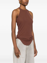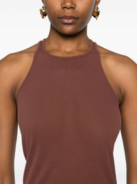Basic Rib tank top Highlights - Earth brown - Ribbed detailing - Round neck - Sleeveless - Racerback - Curved hem Made in Italy Composition FSC Viscose 88%, Silk 12% SIZE & FIT Model measurements Height 5 ft 11 in(1.8 m) Bust/Chest 32.28 in(82 cm) Hips 35.82 in(91 cm) Waist 23.62 in(60 cm) FittingInformation Designed for a slim fit that sits just away from the body offering a close yet comfortable fit Made from a lightweight non-stretch fabric, this piece offers minimal elasticity when worn
