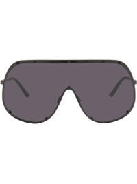 Shield-style stainless steel-frame sunglasses in black. · Gray lens · Rivets at face · Adjustable rubber nose pads · Includes pouch · Size: 157.116 Supplier color: Black/Black