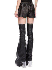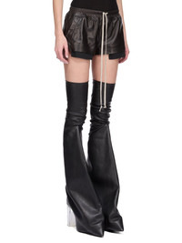 RICK OWENS FW25 CONCORDIANS FOG BOXERS IN BLACK WAXY LAMB LEATHER THESE FOG BOXERS ARE CUT HIGH ON THE THIGH. THEY HAVE AN ELASTICIZED WAISTBAND WITH DRAWSTRING, SIDE WELT POCKETS AND SIDE SLITS. THEY FEATURE VISIBLE POCKET BAGS THAT HANG BELOW THE HEM OF THE BOXERS THIS LIGHTWEIGHT LAMB LEATHER IS FINISHED USING NATURAL WAXES AND ANILINE WHICH MAKES A SUPPLE HANDFEEL BECAUSE THIS SKIN IS NAKED, NOT FINISHED USING ANY PIGMENTS COVERING THE SKIN, NATURAL MARKINGS AND SHADINGS ARE VISIBLE WHICH MAKES EACH SKIN AND PRODUCT UNIQUE THIS TANNERY IS LWG AUDITED COLOR: BLACK MATERIAL: 100% LAMB LEATHER LINING 100% COTTON POCKETS LINING 100% COTTON MODEL IS 181CM TALL MODEL WEARS SIZE 40