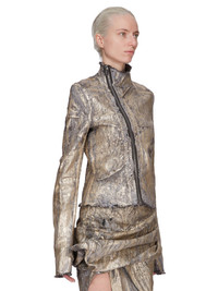 RICK OWENS SS25 HOLLYWOOD GARY JKT IN GOLD GOLD MEGACRUST STRETCH DENIM THIS GARY JACKET IS BELOW-WAIST LENGTH WITH A SKIN TIGHT FIT. IT HAS LONG SLEEVES, A HIGH NECK WITH AN ASYMMETRICAL ZIPPER FRONT OPENING AND LEVEL SHOULDER SEAMS WITH TOPSTITCHING THIS LIGHTWEIGHT GOLD MEGACRUST DENIM IS MADE ON A 10OZ BLACK AND NATURAL STRETCH DENIM. THE READY GARMENT IS OVERDYED DUST AND THEN TREATED WITH LAYERS OF GOLD COLORED FOIL THAT IS PRESSED ON BY HAND. THE NATURAL ASPECTS OF THIS TREATMENT MEANS THE FOIL APPLICATION IS IRREGULAR AND HAS PEELED OFF AND CRACKED IN CERTAIN AREAS AND WILL CONTINUE TO DO SO WITH WEAR AND ABRASION. THIS IS AN INHERENT CHARACTERISTIC OF THIS TYPE OF TREATMENT AND IS A DESIRED A VISUAL ASPECT WHICH ADDS TO THE UNIQUENESS OF EACH PIECE. THIS GARMENT IS TREATED IN AN ITALIAN WASH HOUSE BASED IN THE VENETO AREA OF ITALY, THAT PRODUCES IN SMALLER TREATMENT BATHS TO REDUCE WATER WASTE AND UTILIZE A WATER PURIFYING PROCESS THAT ENABLES THEM TO RECYCLE A PORTION OF THE WATER USED. ALL OF OUR DENIM WASHES ARE ZDHC CERTIFIED COLOR: GOLD MATERIAL: 91% COTTON + 6% ELASTOMULTIESTER + 3% RUBBER MODEL IS 181CM TALL MODEL WEARS SIZE 40