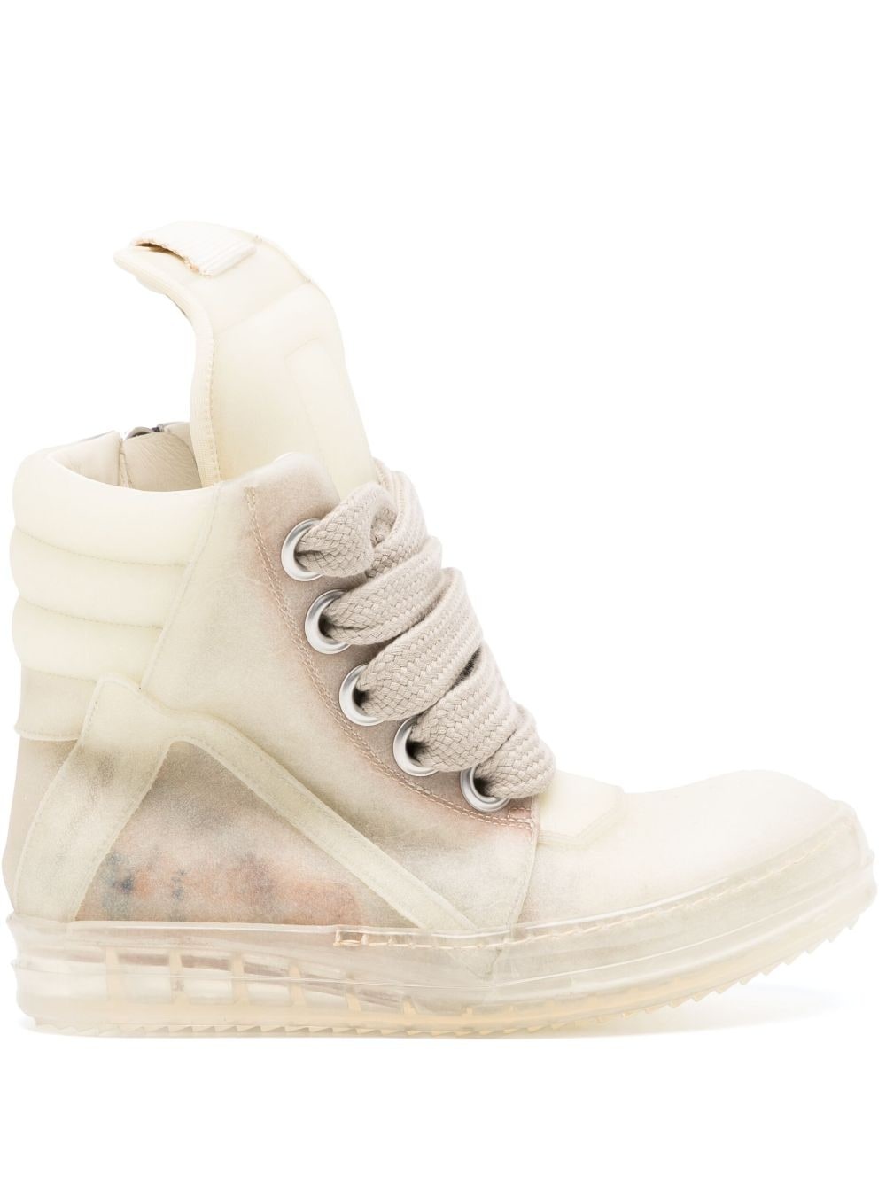Geobasket high-top sneakers Rick Owens' Strobe Geobasket sneakers reimagine the basketball sneaker silhouette, powering the panelled leather construction with a geometric-shaped design. Highlights - Off-white - Distressed finish - Semi-sheer construction - Oversize tongue - Round toe - Front lace-up fastening - Side zip fastening - Transparent rubber sole Made in Italy SIZE & FIT Measurement HEIGHT 4.9 in(12.5 cm) Sole height 1.2 in(3 cm)