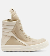 The Geobasket sneakers are Rick Owens' directional take on the classic high-top silhouette. This pair is made from fine-grain leather and boast the brand's signature elongated tongues. Product Details - Upper: leather - Lining: leather - Sole: leather insole, rubber sole - Color: beige - Toe shape: round toe - Made in Italy - Includes: shoe box, dust bag - Designer color name: Sand/Milk/Milk - Closure: zipped side - Item number: P01149151 Size & Fit - True to size - European sizes