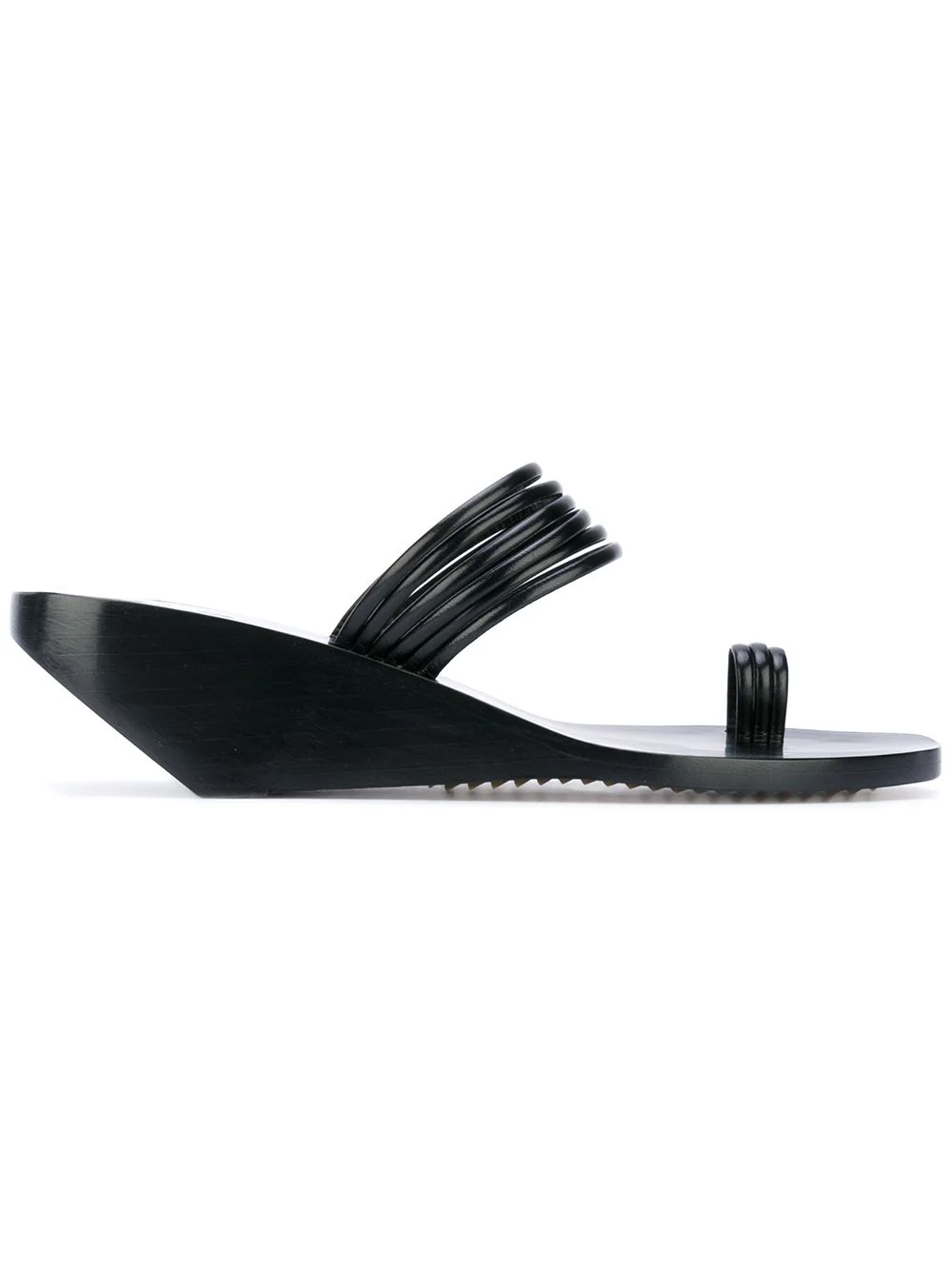 geometric sandals Rick Owens collection reflects immaculate tailoring with a hard-edged decadence and femininity. These classic black leather geometric wedge sandals feature an open toe, a slip-on style and a low wedge heel. Made in Italy Composition Sole: Calf Leather 100%, Rubber 100% Outer: Calf Leather 100% Lining: Calf Leather 100% SIZE & FIT Measurement HEEL 1.96 in(5 cm)
