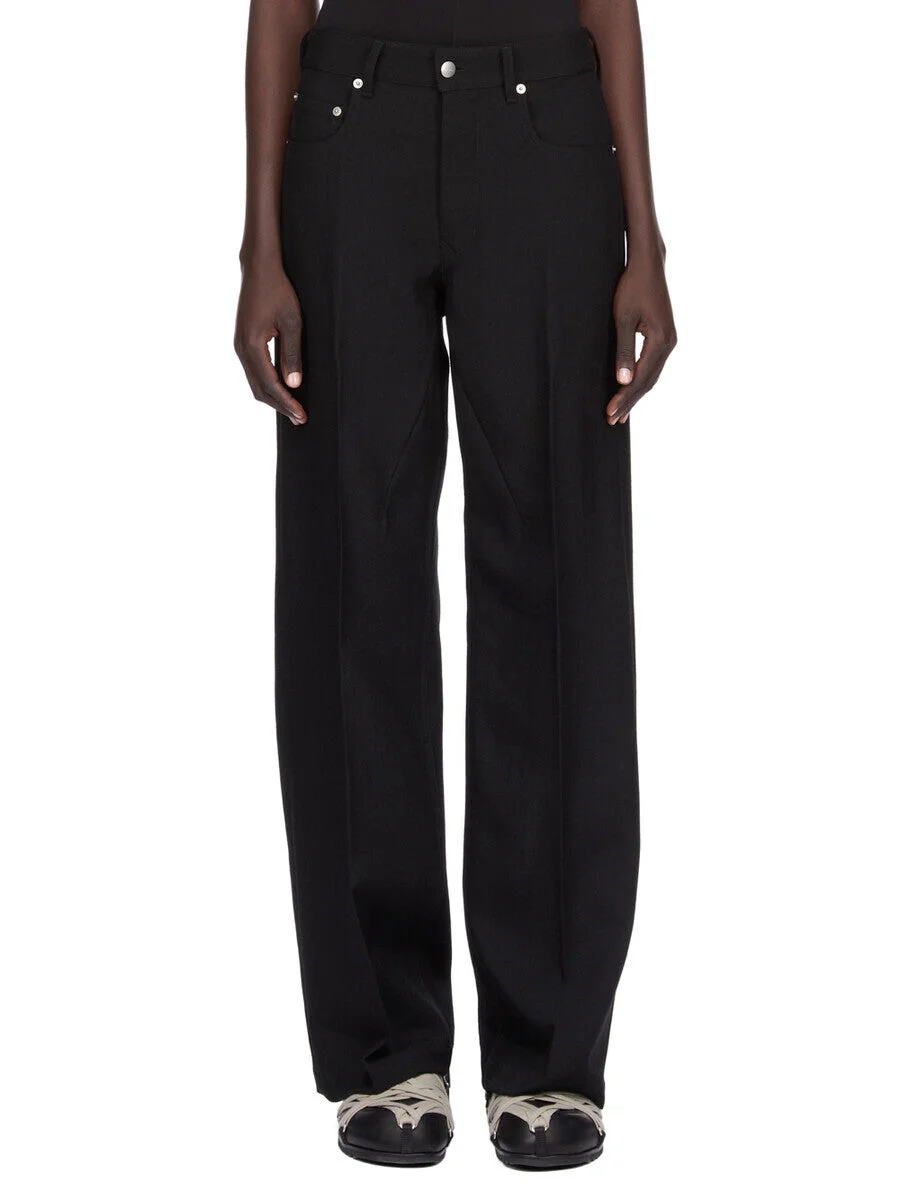 RICK OWENS SS26 TEMPLE GETH JEANS IN BLACK WOOL GAUZE THESE GETH JEANS ARE A FULL LENGTH 5 POCKET JEAN WITH A LOW-RISE AND WIDE FIT. THEY HAVE A SILVER BUTTON FLY, BELT LOOPS AND POCKET RIVETS. THIS LIGHTWEIGHT AND SEMI TRANSPARENT WOOL GAUZE HAS A SOFT HANDFEEL. IT IS WOVEN IN THE BIELLA REGION OF ITALY RENOWNED FOR ITS LONG TRADITION OF TAILORED WOOL. THIS FABRIC IS MADE FROM ZQ CERTIFIED VIRGIN WOOL WHICH ENSURES A HIGH STANDARD IN ANUMAL WELFARE, ENVIRONMENTAL SUSTAINIBILITY AND SOCIAL RESPONSIBILITY. EACH BALE OF WOOL IS TRACEABLE BACK TO ITS SOURCE. COLOR: BLACK MATERIAL:100% NEW WOOL MODEL IS 181CM TALL MODEL WEARS SIZE 26