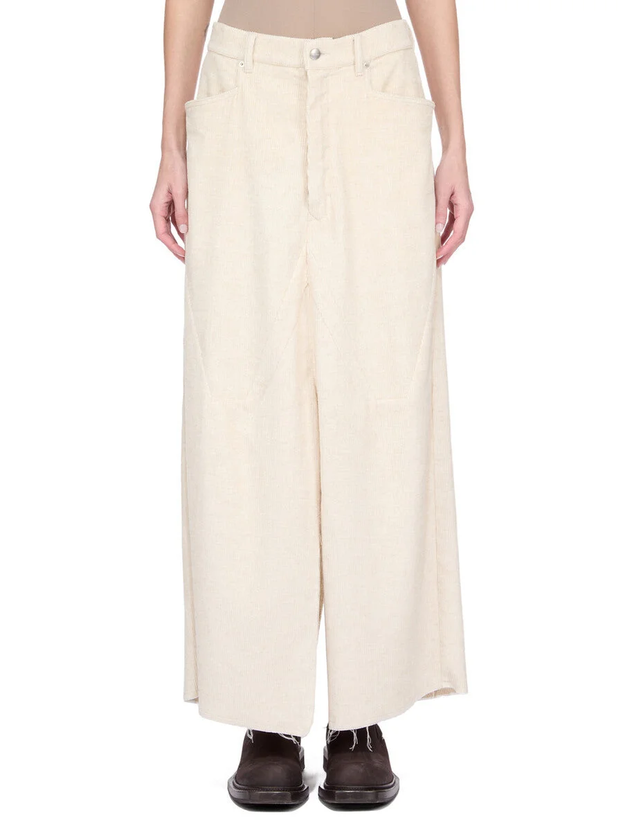 RICK OWENS FW25 CONCORDIANS LONG SLIVERED SKIRT IN NATURAL LINEN CORDUROY THIS SLIVERED SKIRT IS AN ANKLE LENGTH 5 POCKET JEAN SKIRT. IT HAS A WAISTBAND WITH CONCEALED ZIP FLY, TOP BUTTON AND BELT LOOPS WITH RIVETS. IT PEAKS SLIGHTLY BETWEEN THE LEGS, TAPERING TO POINTS AT THE KNEE, AND FEATURES ANGULAR GEO PANELS ON THE FRONT THIGHS. THIS MEDIUMWEIGHT COTTON AND LINEN BLEND CORDUROY HAS A SOFT HANDFEEL. THE COLOR OF THIS CORDUROY IS NATURAL WITH SLUBS AND IMPURITIES VISIBLE AS A PART OF THE COLORATION. THIS FABRIC IS MADE USING GOTS CERTIFIED ORGANIC COTTON WHICH MEANS THE NATURAL FIBER IS GROWN WITHOUT HARMFUL CHEMICALS, LEAVING OUR SOIL, AIR AND WATER CLEANER FROM CONTAMINATES. COLOR: NATURAL MATERIAL: 74% COTTON + 26% LINEN MODEL IS 181CM TALL MODEL WEARS SIZE 26