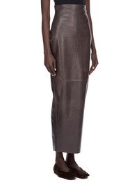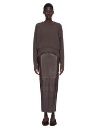 RICK OWENS FW25 CONCORDIANS DIRT PILLAR IN DARKDUST WAXY LAMB LEATHER THIS DIRT PILLAR SKIRT IS ANKLE-LENGTH WITH A TIGHT FIT. IT HAS AN EXTRA HIGH WAIST WITH BACK ZIPPER, A TAPERED SKIRT AND A SPLIT IN THE CENTRE BACK SEAM UP TO THE KNEE THIS LIGHTWEIGHT LAMB LEATHER IS FINISHED USING NATURAL WAXES AND ANILINE WHICH MAKES A SUPPLE HANDFEEL BECAUSE THIS SKIN IS NAKED, NOT FINISHED USING ANY PIGMENTS COVERING THE SKIN, NATURAL MARKINGS AND SHADINGS ARE VISIBLE WHICH MAKES EACH SKIN AND PRODUCT UNIQUE THIS TANNERY IS LWG AUDITED COLOR: DARKDUST MATERIAL: 100% LAMB LEATHER LINING 94% CUPRO + 6% ELASTANE MODEL IS 181CM TALL MODEL WEARS SIZE 40