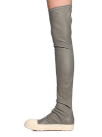 RICK OWENS FW25 CONCORDIANS HIGH STOCKING SNEAKS IN WASHED INDIGO/MILK/MILK STRETCH LAMB LEATHER THESE HIGH STOCKING SNEAKS ARE ABOVE KNEE HEIGHT. THEY HAVE STRETCH LEATHER STOCKING UPPERS, DRAPING AROUND THE UPPER FOOT AND ANKLE, TOE CAPS AND SHARK-TOOTHED BUMPER SOLES. THIS STRETCH LAMB LEATHER HAS A SMALL GRAIN TEXTURE AND MATTE FINISH. THIS LEATHER IS MADE BY A SECOND GENERATION FAMILY OWNED TANNERY IN THE SOUTH OF FRANCE SPECIALIZING ONLY IN STRETCH LEATHER PRODUCTION. EACH SKIN IS STRETCHED OUT TO ITS LIMIT AND BONDED TO A COTTON AND LYCRA FABRIC BACKING. WHEN DYED, THE HEAT OF THE PROCESS ACTIVATES THE LYCRA ELASTIC FIBRES THAT SHRINK THE FABRIC AND WITH IT THE SKIN, BACK TO ITS ORIGINAL SIZE. THE LEATHER THEN EXITS THE PROCESS AS STRETCH. COLOR: WASHED INDIGO/MILK/MILK MATERIAL: UPPER 65% LAMB LEATHER + 34% COTTON + 1% SPANDEX TOE 100% CALF LEATHER LINING 100% CALF LEATHER INSOLE 100% CALF LEATHER SOLE 100% THERMOPLASTIC RUBBER SOLE HEIGHT 3.5CM