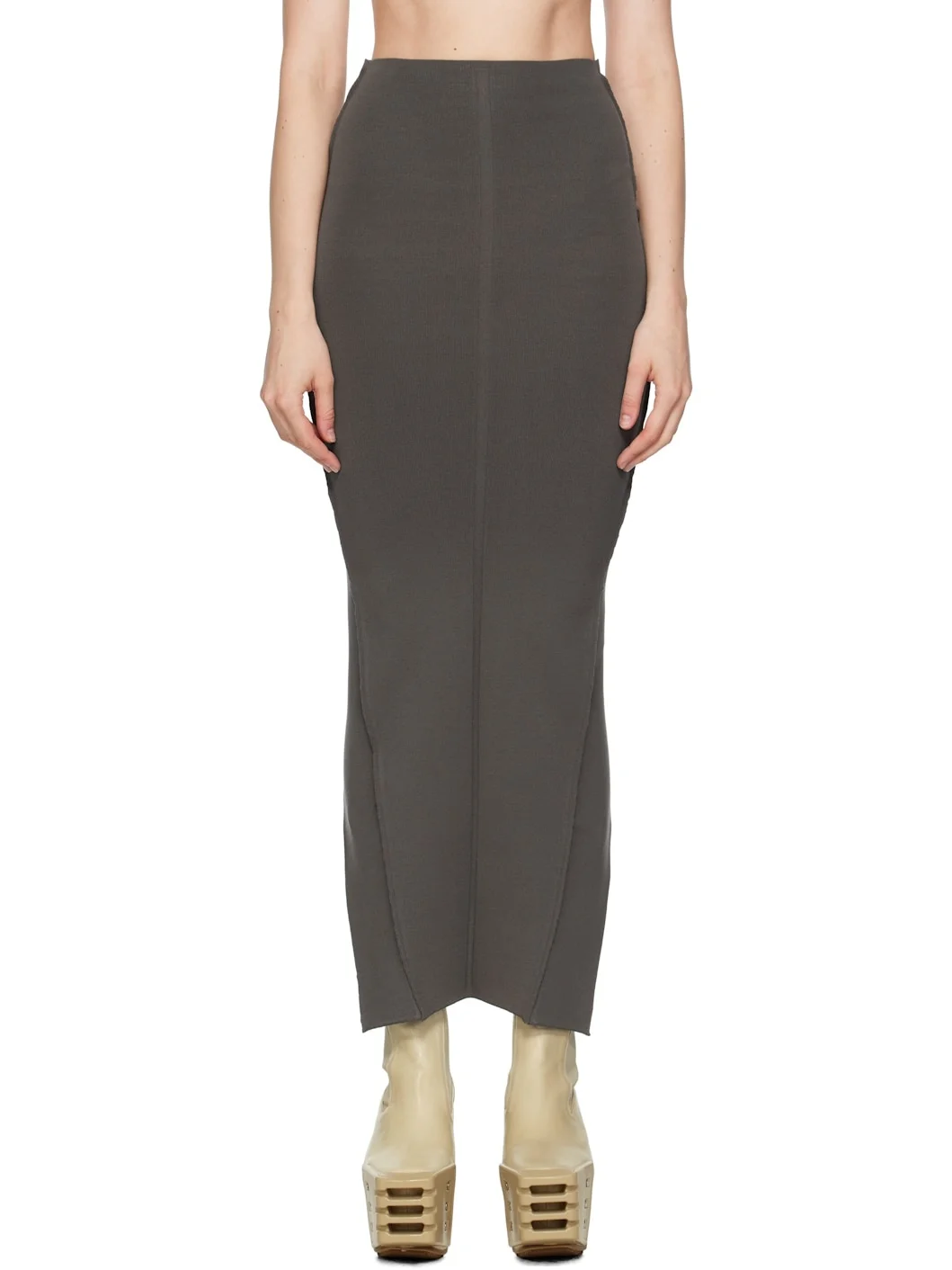 Rib-knit stretch ECOVERO™ viscose-blend maxi skirt. · Elasticized waistband · Pinched side seams · Central garter-stitch stripe at front and back · Central vent at back hem Supplier color: Dark dust 63% viscose, 27% polyester, 7% nylon, 3% elastane. Made in Italy 252232F093007