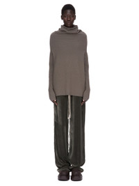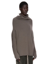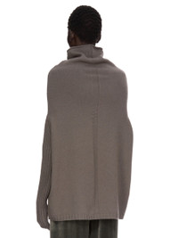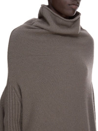 RICK OWENS FW25 CONCORDIANS SHROUD IN DUST LAS PALMAS CASHMERE KNIT THIS SHROUD IS MID THIGH LENGTH AND FEATURES A DRAPED TUBULAR NECK THAT WIDENS OVER THE SHOULDERS AND FALLS TO LOW ARM HOLES WITH LONG LOOSE SLEEVES. IS HAS A KNIT CHANNEL RUNNING DOWN THE CENTRE BACK. THIS HEAVYWEIGHT CASHMERE KNIT HAS A SOFT AND WARM HANDFEEL. IT IS KNITTED BOTH IN A CLASSIC RASATO STITCH AND A WIDE RIB. COLOR: DUST MATERIAL: 100% CASHMERE MODEL IS 181CM TALL MODEL WEARS SIZE S