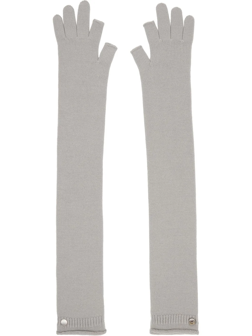 Pair of elbow-length knit virgin wool gloves. · Rolled edge at cuffs, index, and thumb · Logo-engraved press-stud at top cuffs Supplier color: Pearl 100% virgin wool. Made in Italy 252232F012003