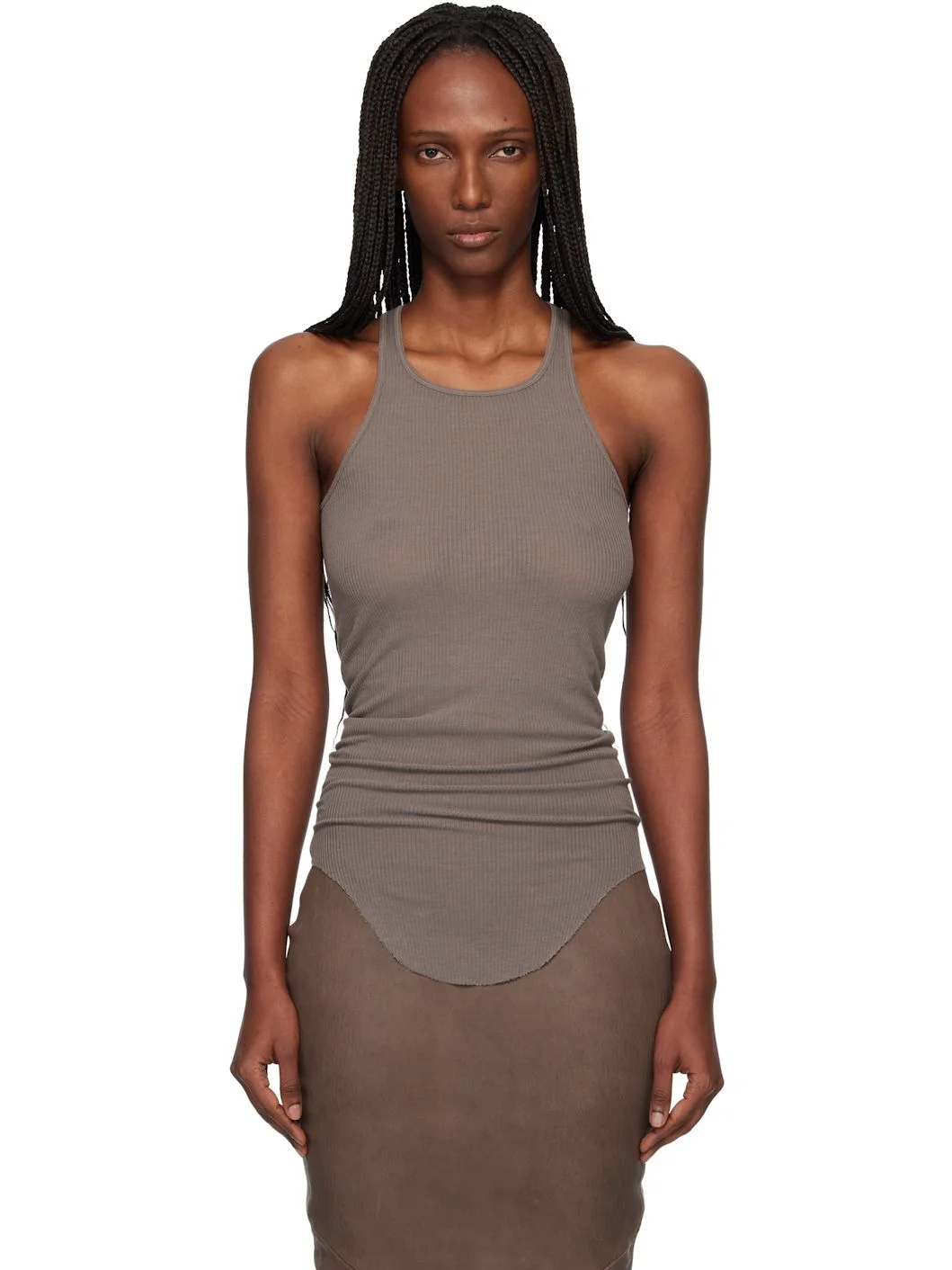 Semi-sheer rib-knit viscose- and silk-blend tank top. · FSC-certified viscose · Crewneck · Raw edge at curved hem · Central seam at back Supplier color: Dust 88% viscose, 12% silk. Made in Italy 261232F111008