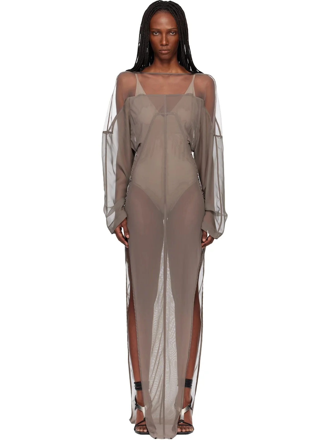 Sheer stretch nylon mesh, nylon tulle, and silk chiffon maxi dress. · Paneled construction · Boatneck · Slit at side seams · Gathering at side seams and back · Yoke sleeves · Button fastening at back collar Supplier color: Dust Body 1: 93% nylon, 7% elastane. Body 2: 100% silk. Body 3: 100% nylon. Made in Italy 261232F055008