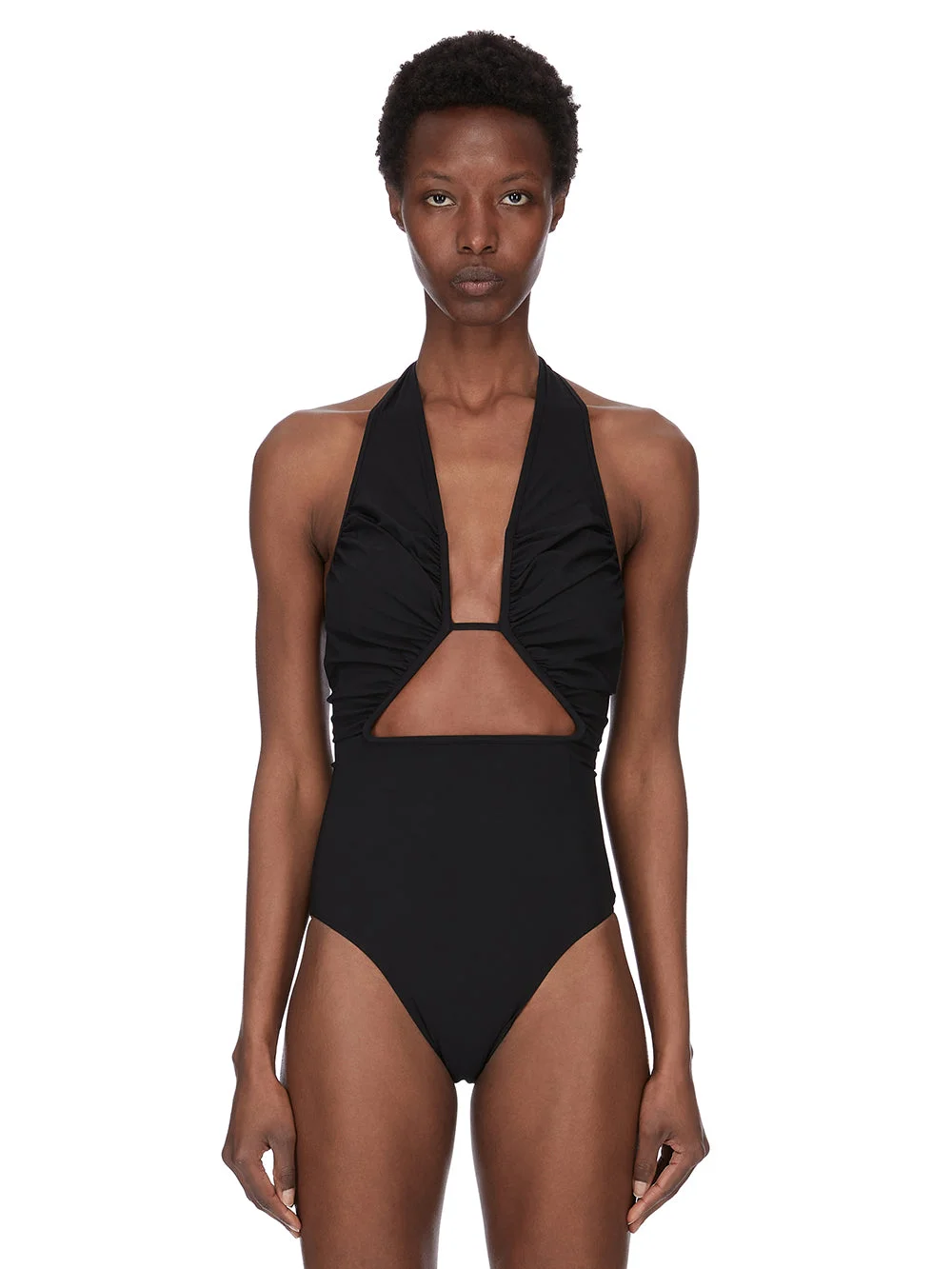 RICK OWENS SS26 TEMPLE HALTER PRONG BATHER IN BLACK SWIM JERSEY THIS HALTER PRONG BATHER IS A ONE PIECE, TIGHT FITTING, RUCHED BODY THAT GATHERS INTO THE CENTRE BUST WITH A BONED GEOMETRIC CUT OUT FRONT AND A WIDE HALTER NECK STRAP. IT HAS THE SIGNATURE CENTRE BACK SEAM RUNNING DOWN THE SPINE. THIS MEDIUMWEIGHT MATTE SWIMWEAR JERSEY HAS COMFORT STRETCH AND IS PRODUCED ESPECIALLY FOR SWIMWEAR WITH HIGH UV AND CHLORINE RESISTANCE. IT IS MADE USING ECONYL® RECYCLED POLYAMIDE, MADE FROM 100% WASTE MATERIAL THAT WOULD OTHERWISE POLLUTE THE EARTH. COLOR: BLACK MATERIAL:79% NYLON + 21% ELASTANE MODEL IS 181CM TALL MODEL WEARS SIZE 40