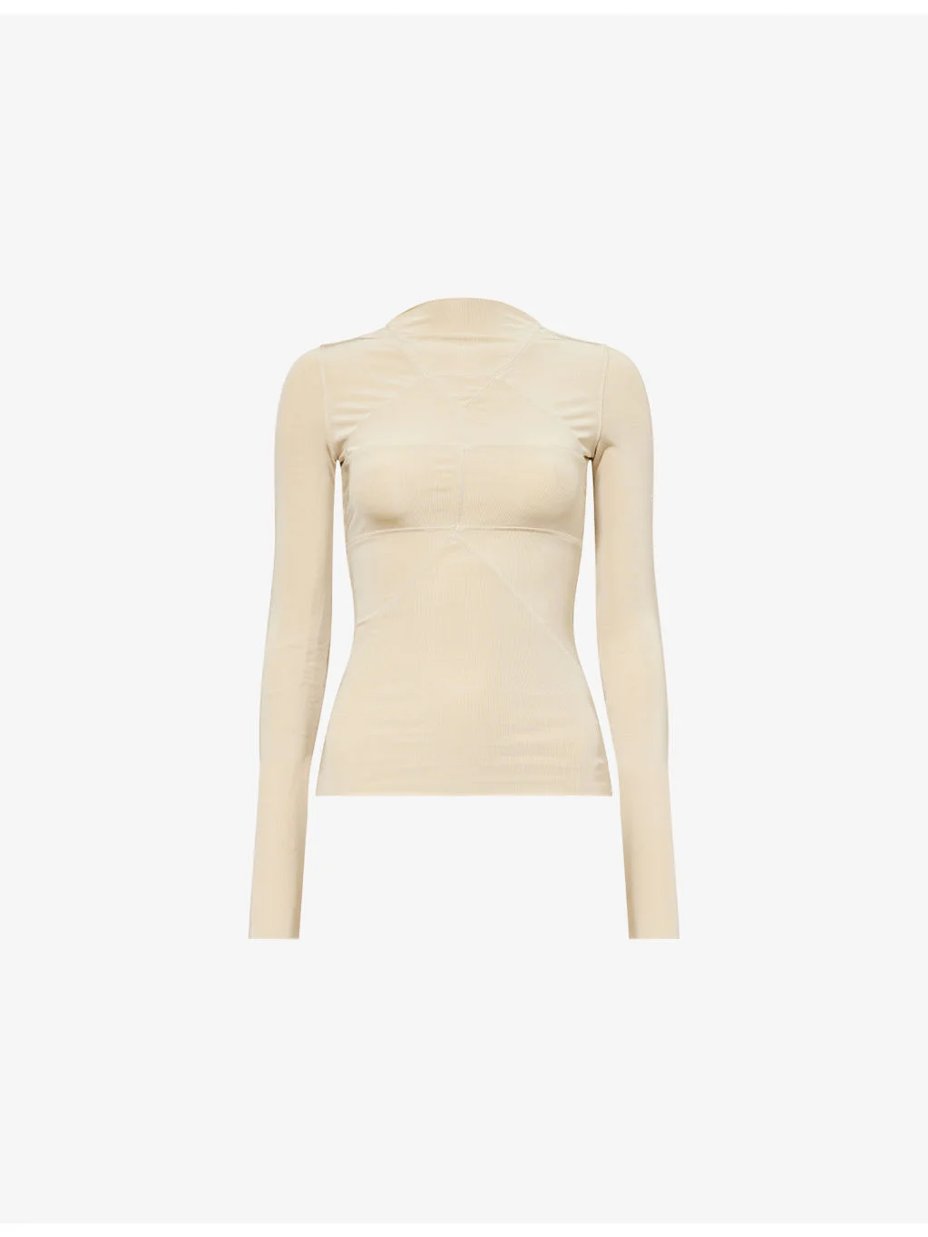 PRODUCT DETAILS - Rick Owens stretch-woven top - 96% viscose, 4% elastane - Fitted, high neck, long sleeves, raw edge trims, stitched raised seams at front - Hand wash - Made in Italy - True to size - Model is 5ft 10in/1.78m and wears a size UK 8 - Lightweight, stretchy Ref: R04618952