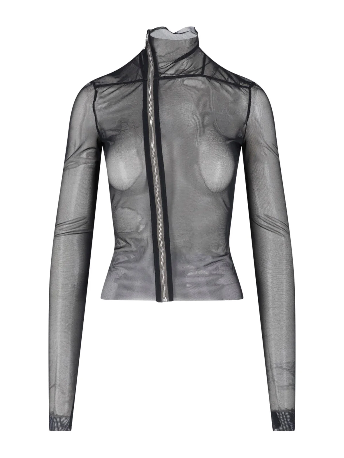 - HIGH NECK TOP BY RICK OWENS IN SEMI-TRANSPARENT BLACK STRETCH FABRIC - HIGH NECK - LONG SLEEVES - FRONT ZIP CLOSURE PRODUCT INFO PRODUCT CODE RO01F6701 TUS09 COMPOSITION: 93% POLYAMIDE, 7% ELASTANE SIZE AND FIT: REGULAR FIT MADE IN: ITALY